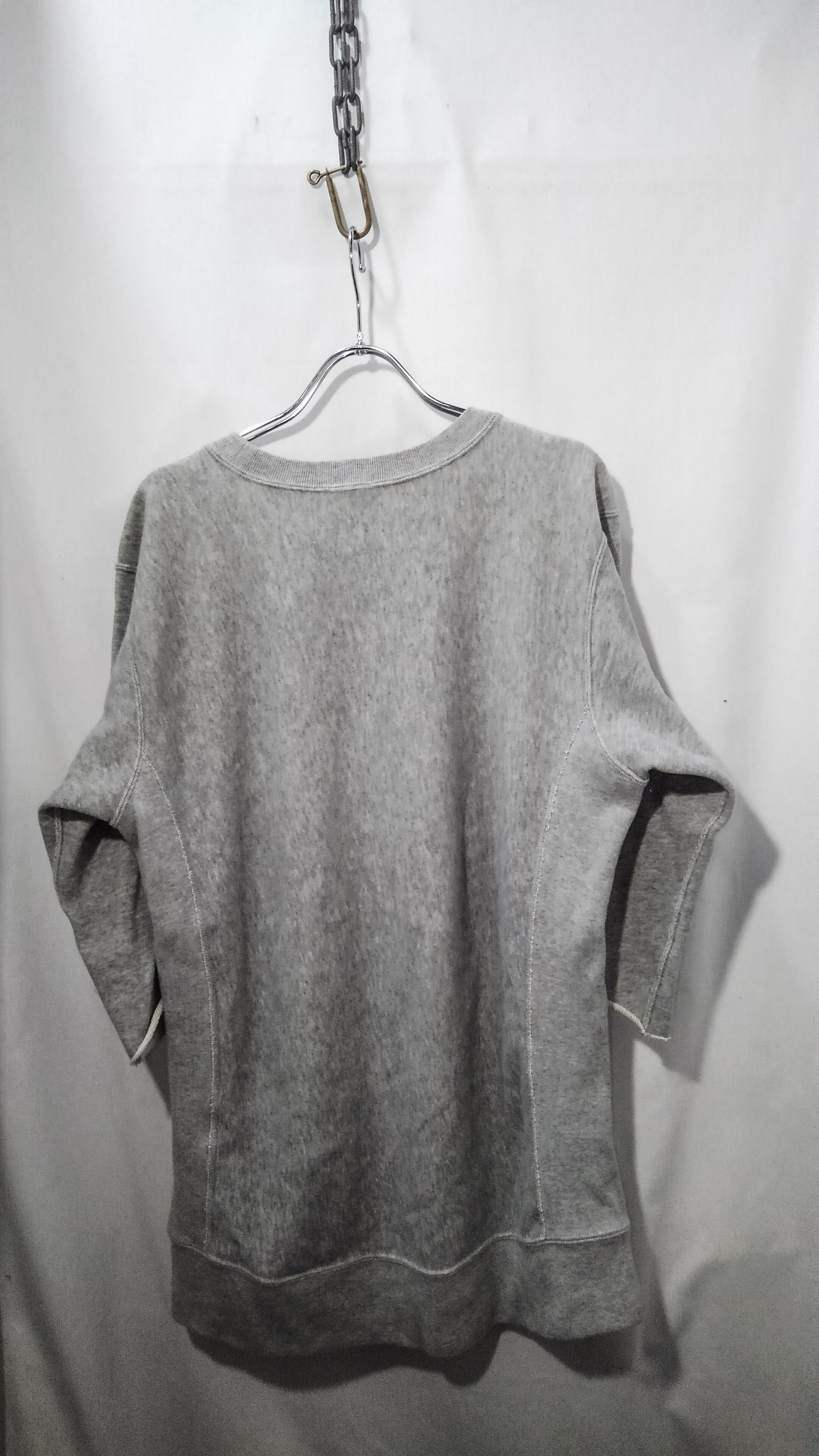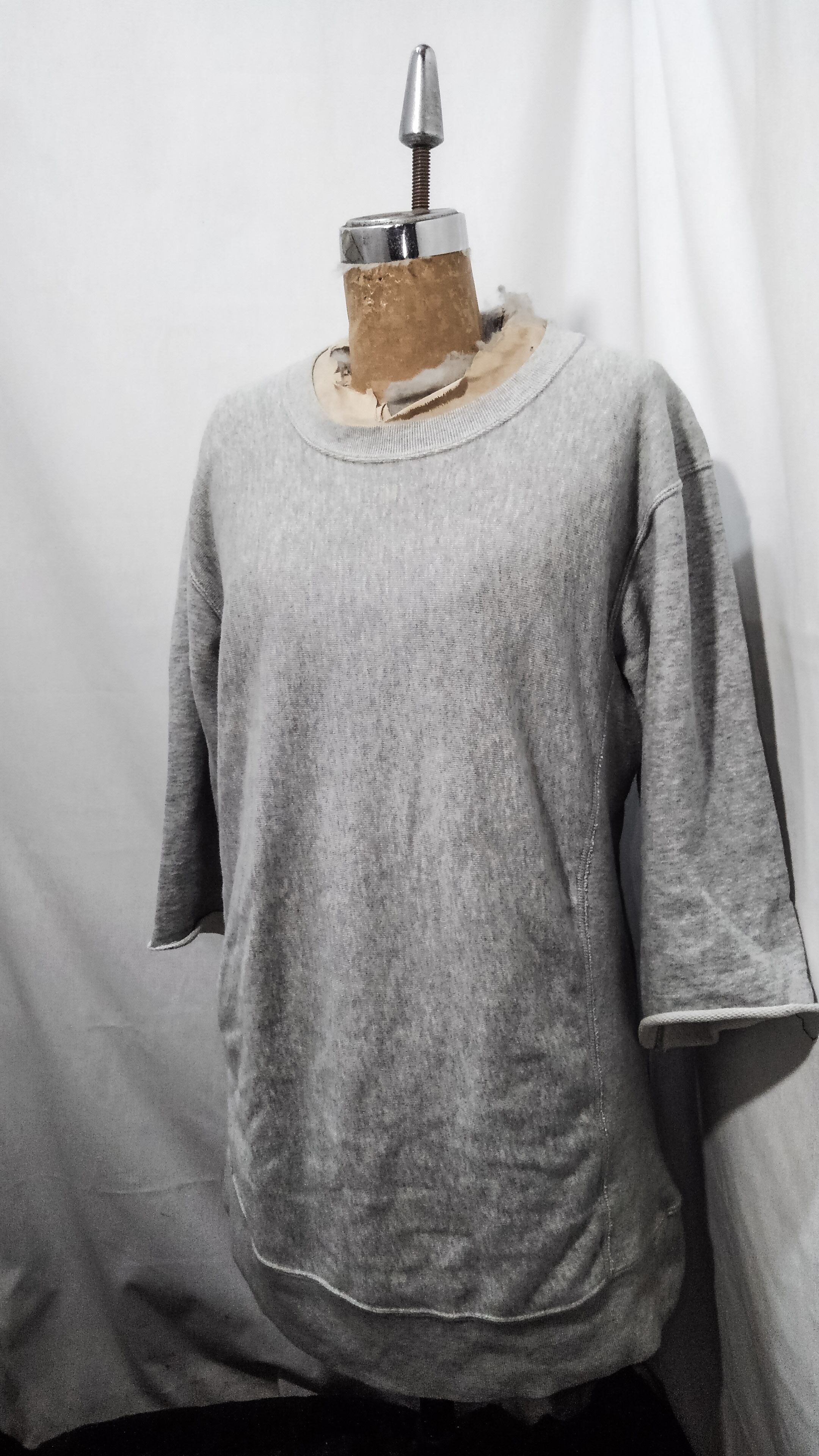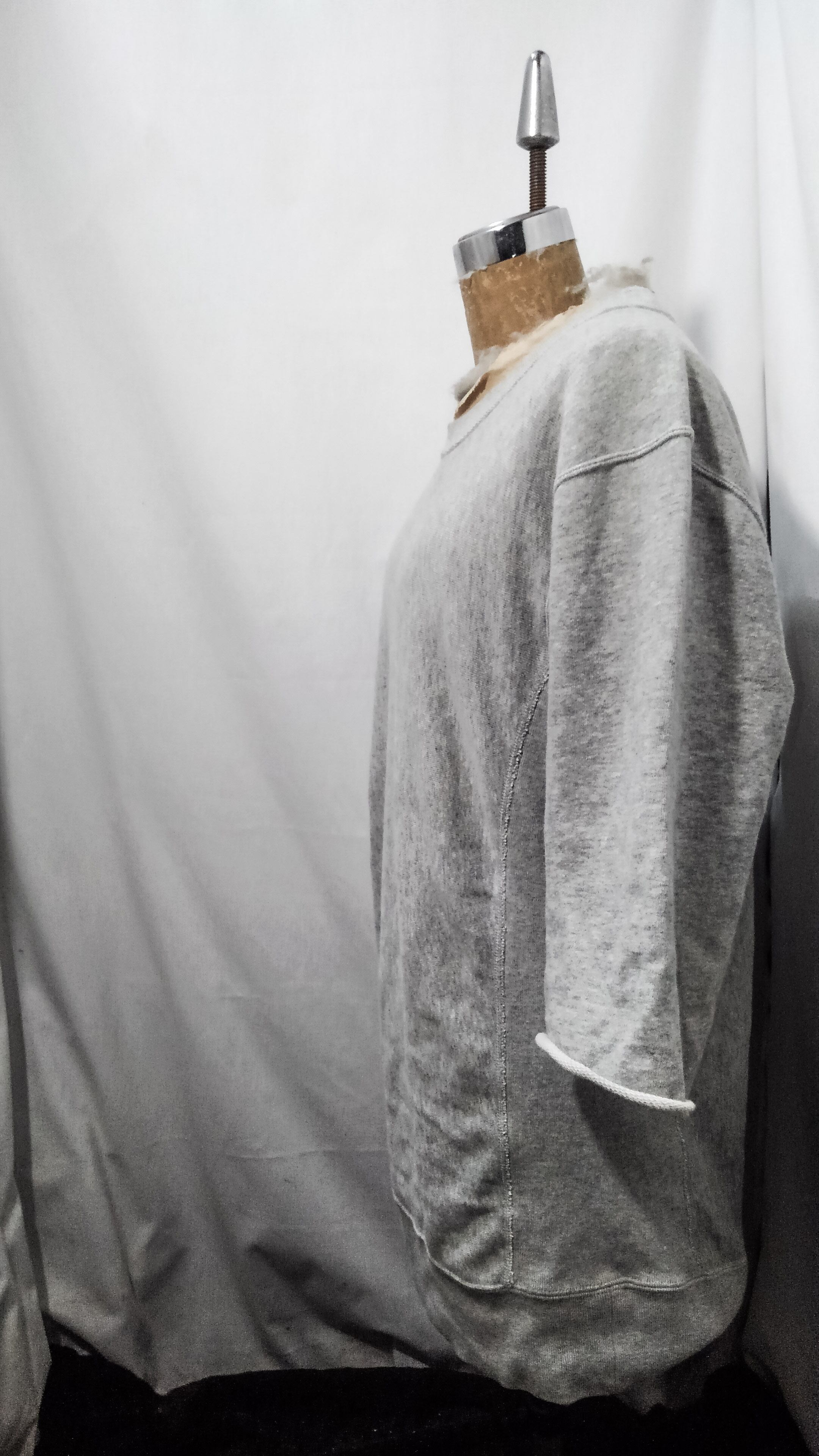 コットン100%の裏毛パイル生地で肌触りが良くすっきりとしたシルエットで、無地の杢グレーですので着回しも利き、両袖は七分丈ほどにカットオフされているので使い方によってはオールシーズン活躍してくれそうです。