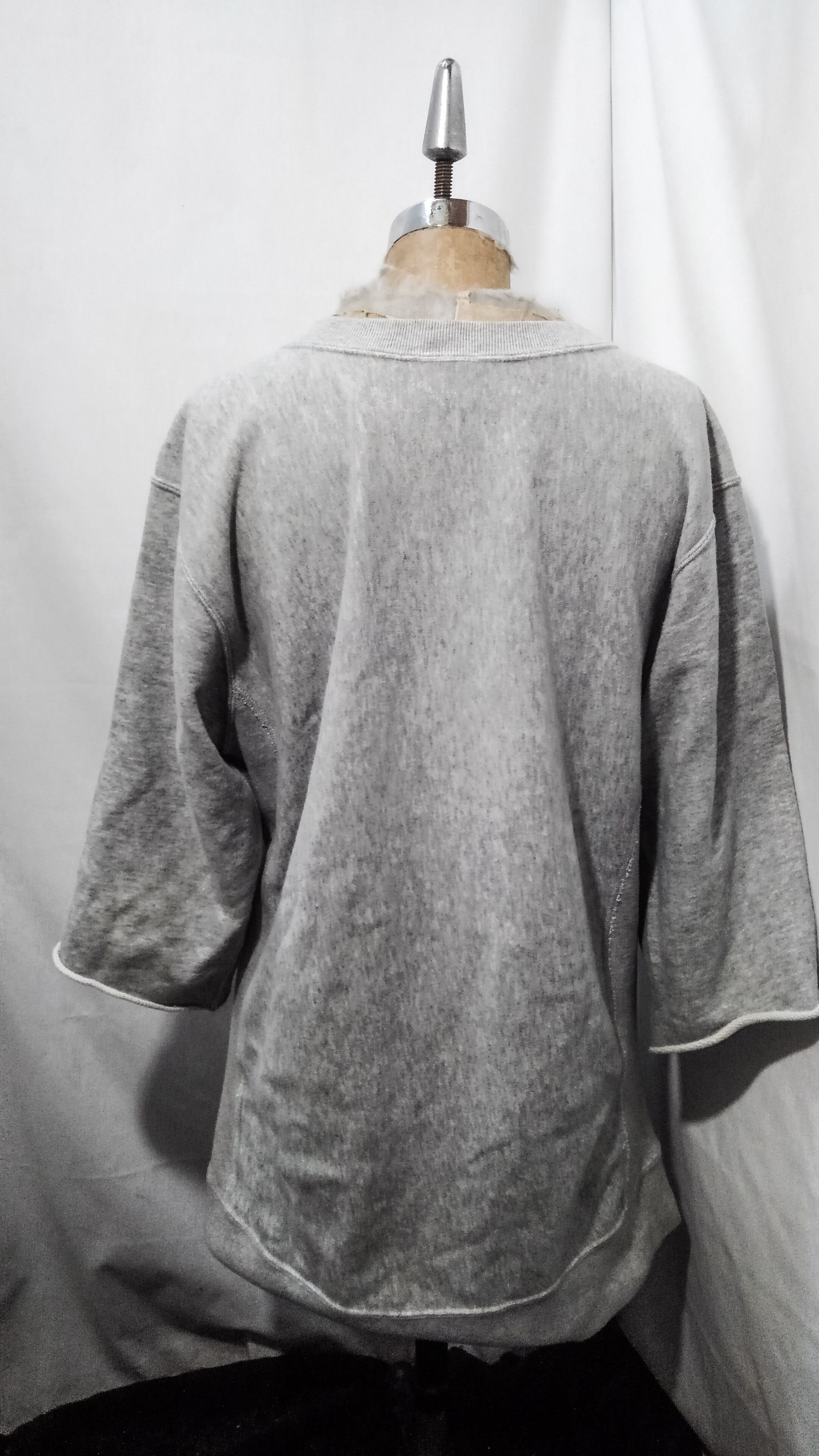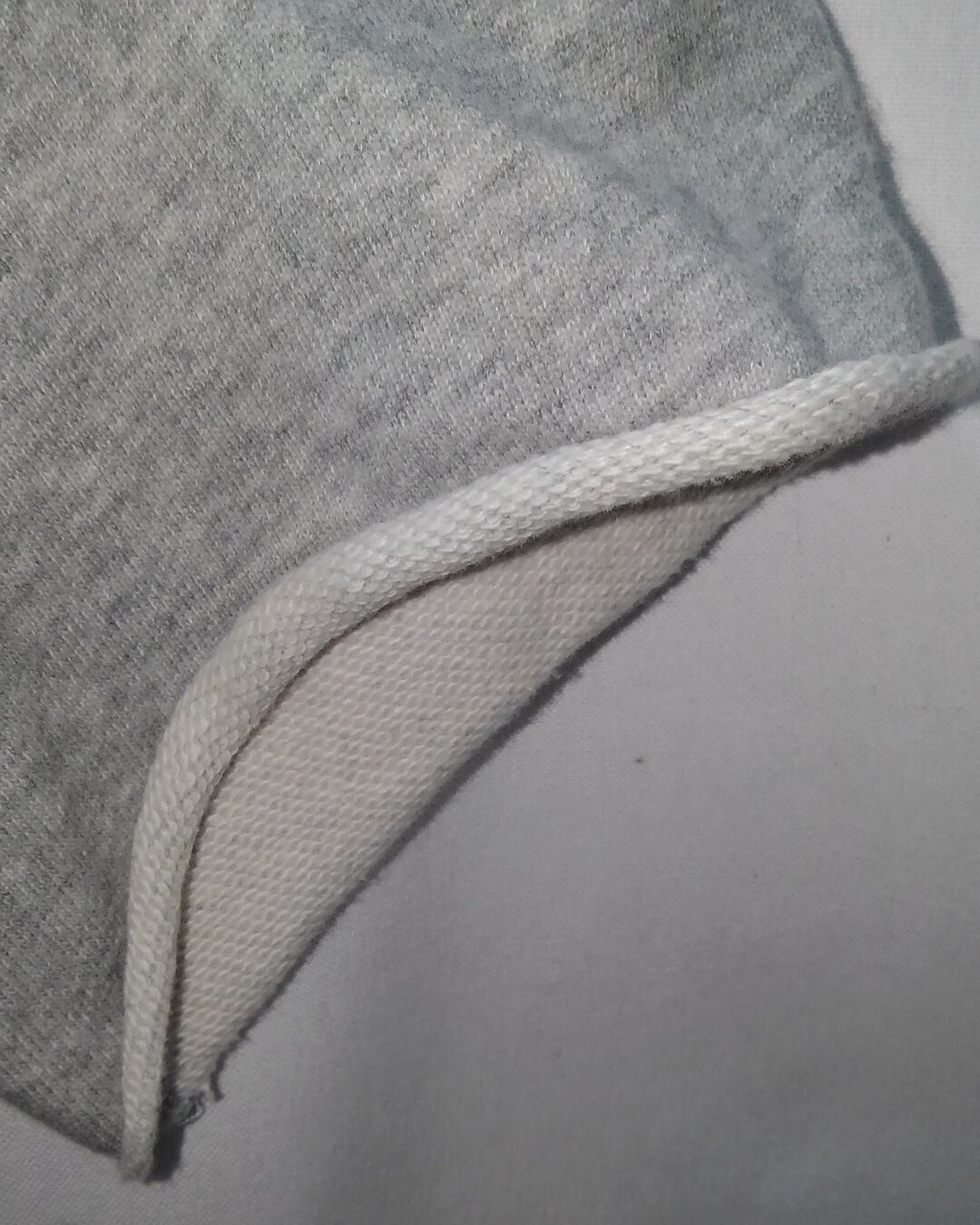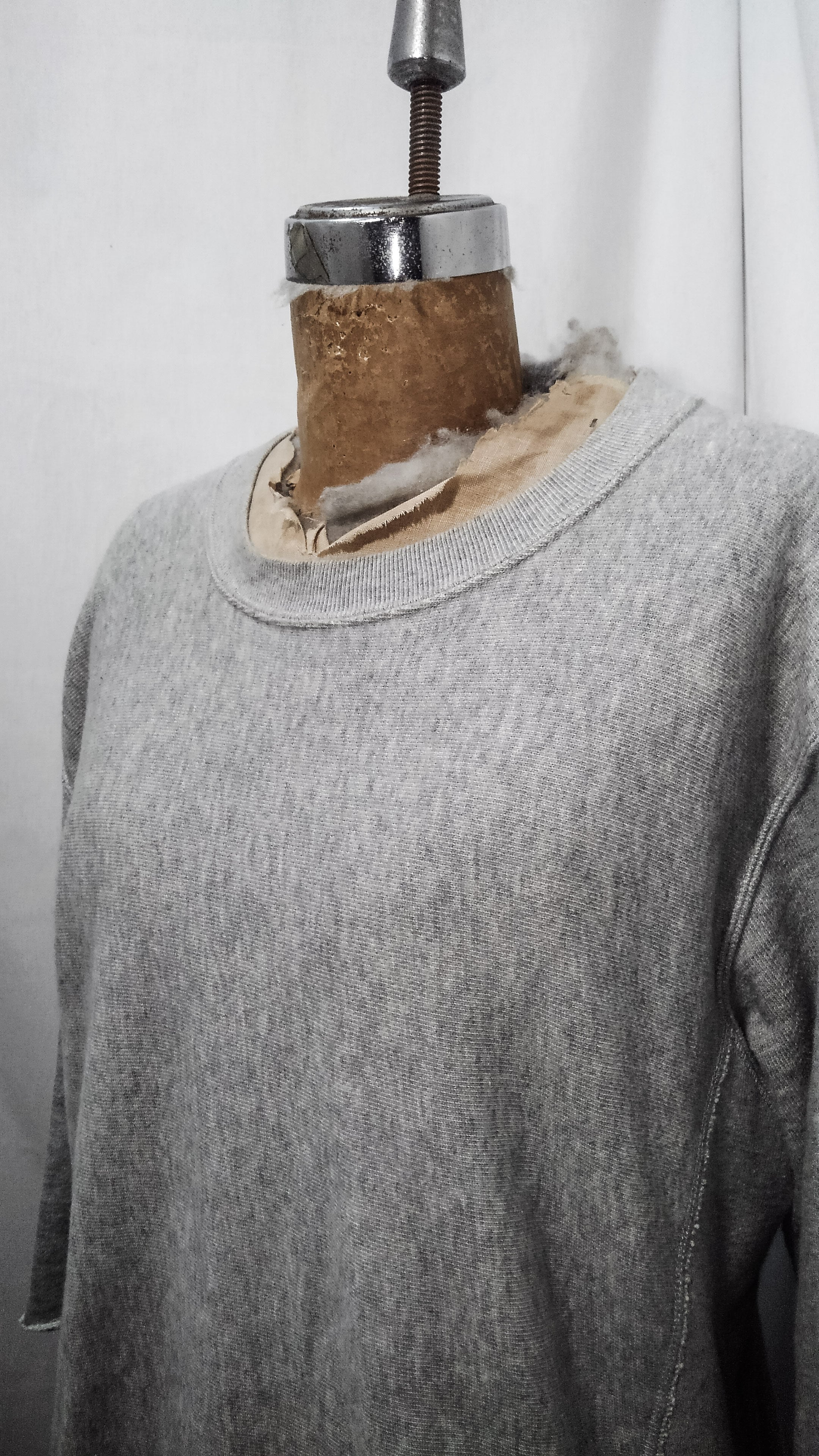 コットン100%の裏毛パイル生地で肌触りが良くすっきりとしたシルエットで、無地の杢グレーですので着回しも利き、両袖は七分丈ほどにカットオフされているので使い方によってはオールシーズン活躍してくれそうです。