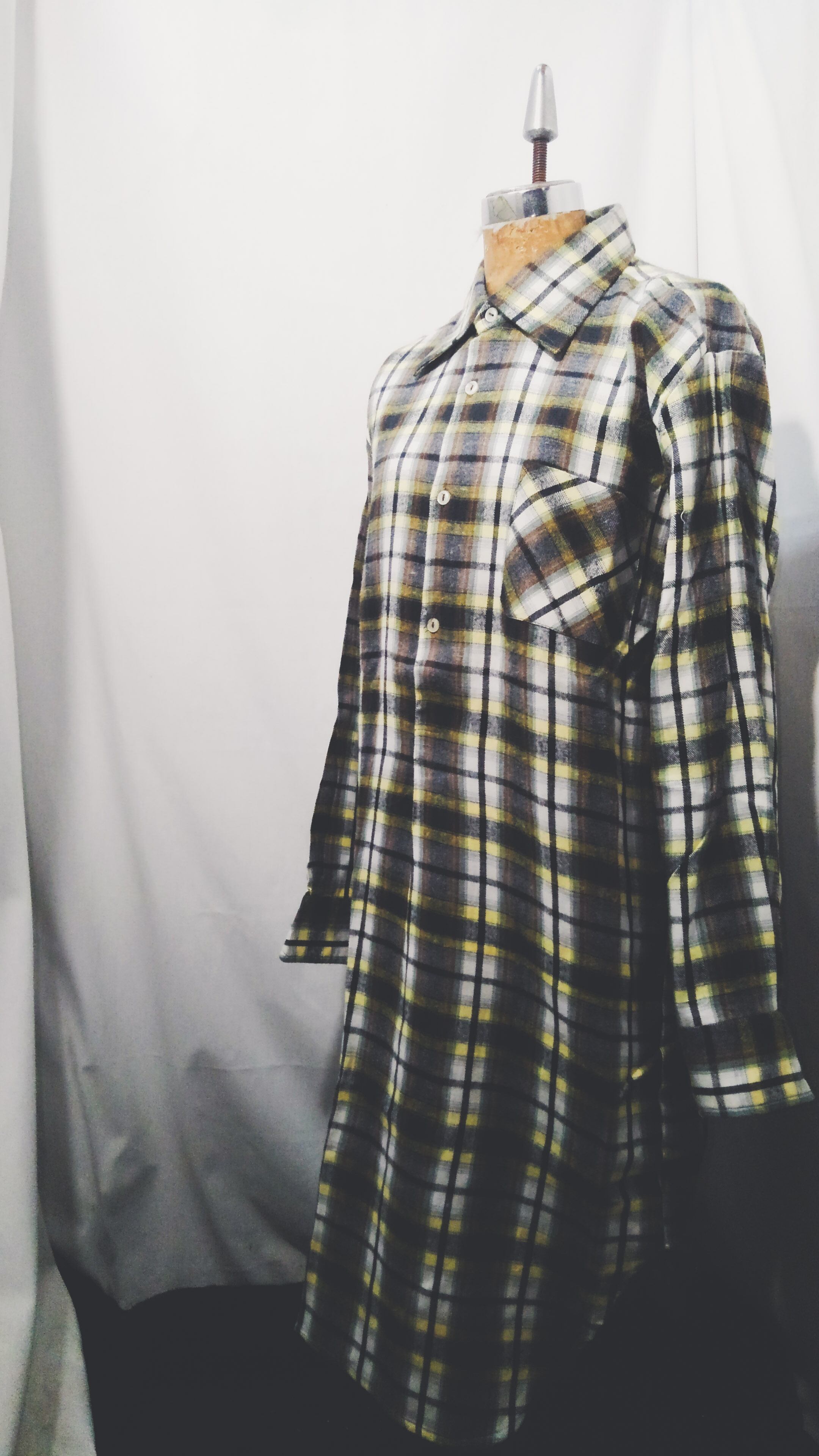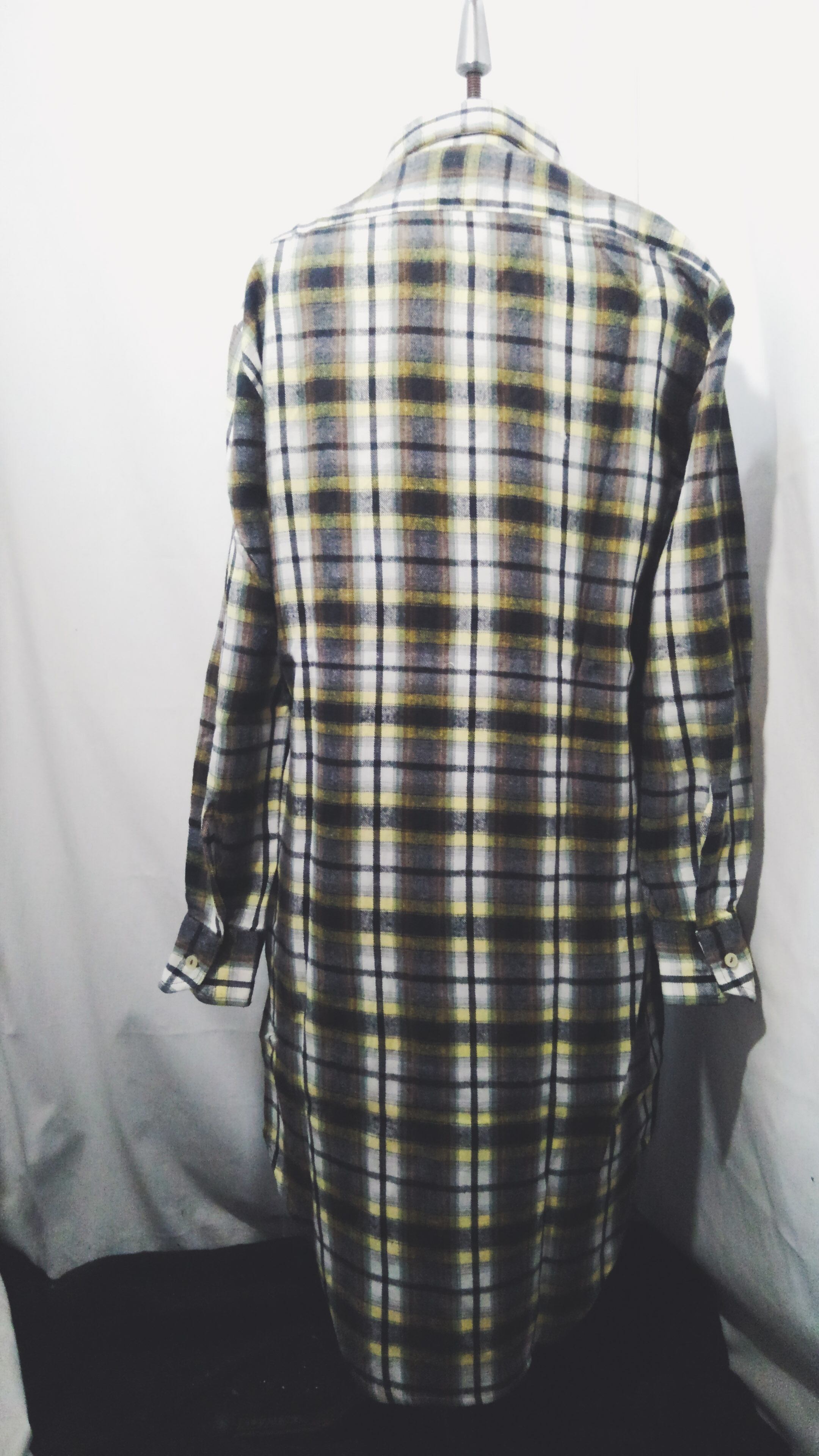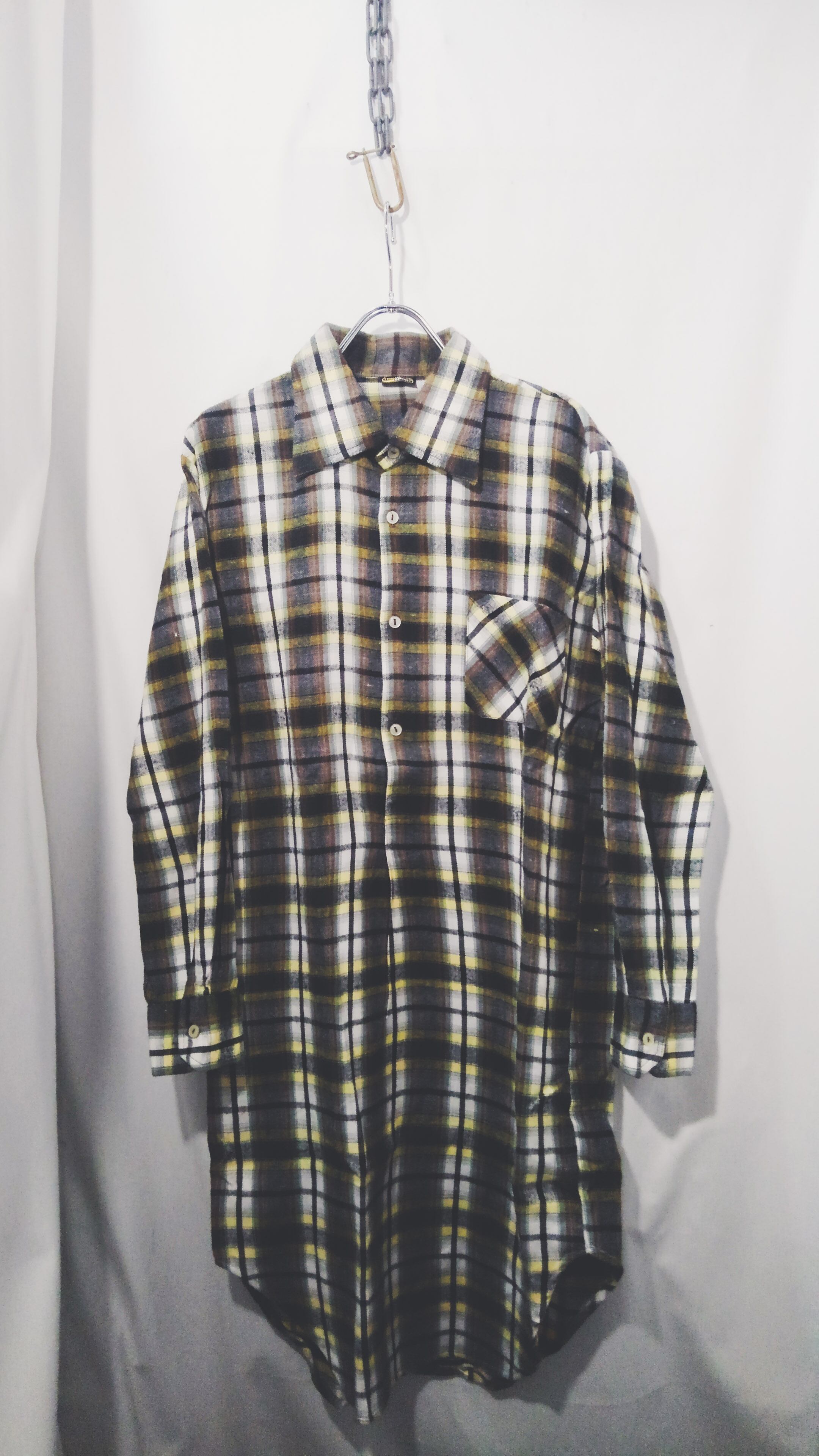 "bugelfrei"(ノーアイロン)の表記がある事からドイツのブランドで、着丈の長いラウンドカットのプルオーバータイプシャツなのでおそらくスリーピングシャツ(パジャマシャツ)として販売されていたモノかと思われます。