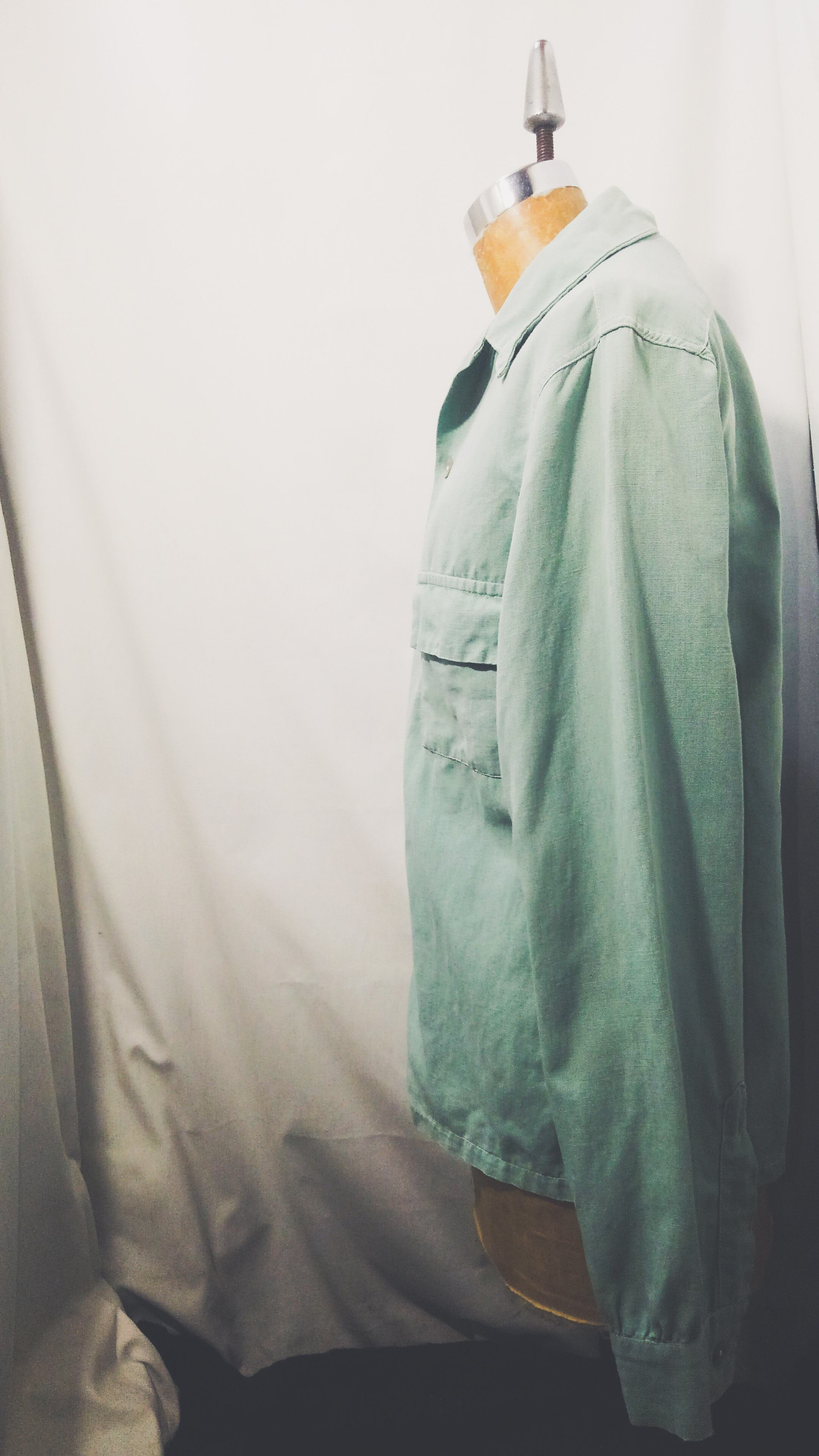 弧を描いて長く垂れ下がった袋襟のロングポイントにフラップのついた胸ポケ、ボタンは全てシェルボタンで形の綺麗なボックスシルエットは40年代を象徴するディテールです。