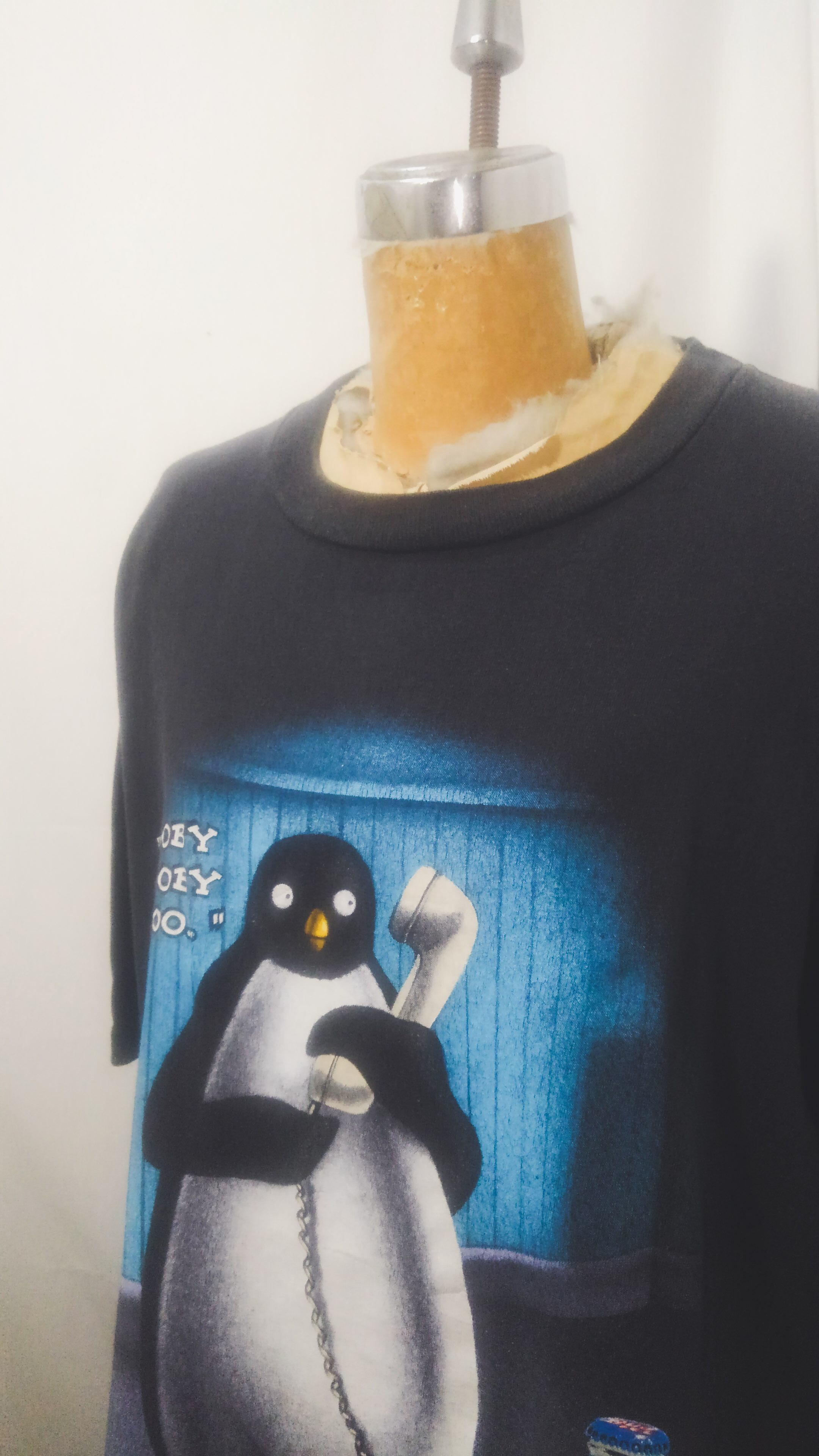 両面プリントでポップなキャラクターのペンギンにちょっぴりホラーな要素を取り入れた二コマ漫画の様なトーリー性のあるプロモーションプリントがアメリカらしいです。