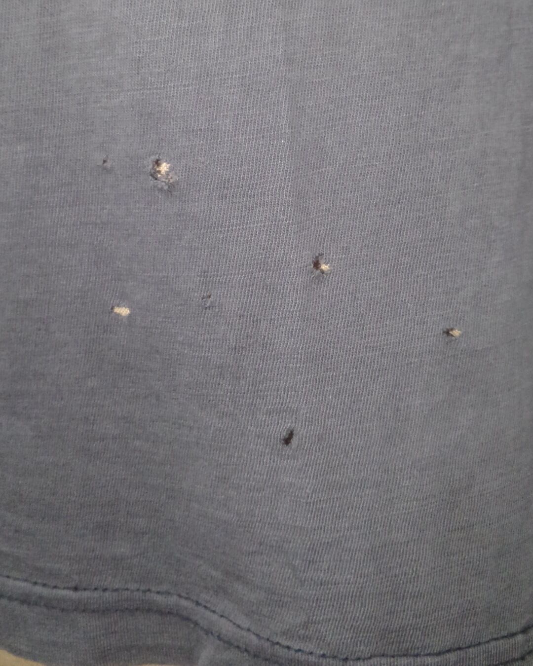 全体的に使用感があり、生地が薄くなっています。ほか、前身頃辺りに小さな穴が複数ございますが程よい墨黒のフェード感と相まってビンテージライクな良い雰囲気に仕上がっています。