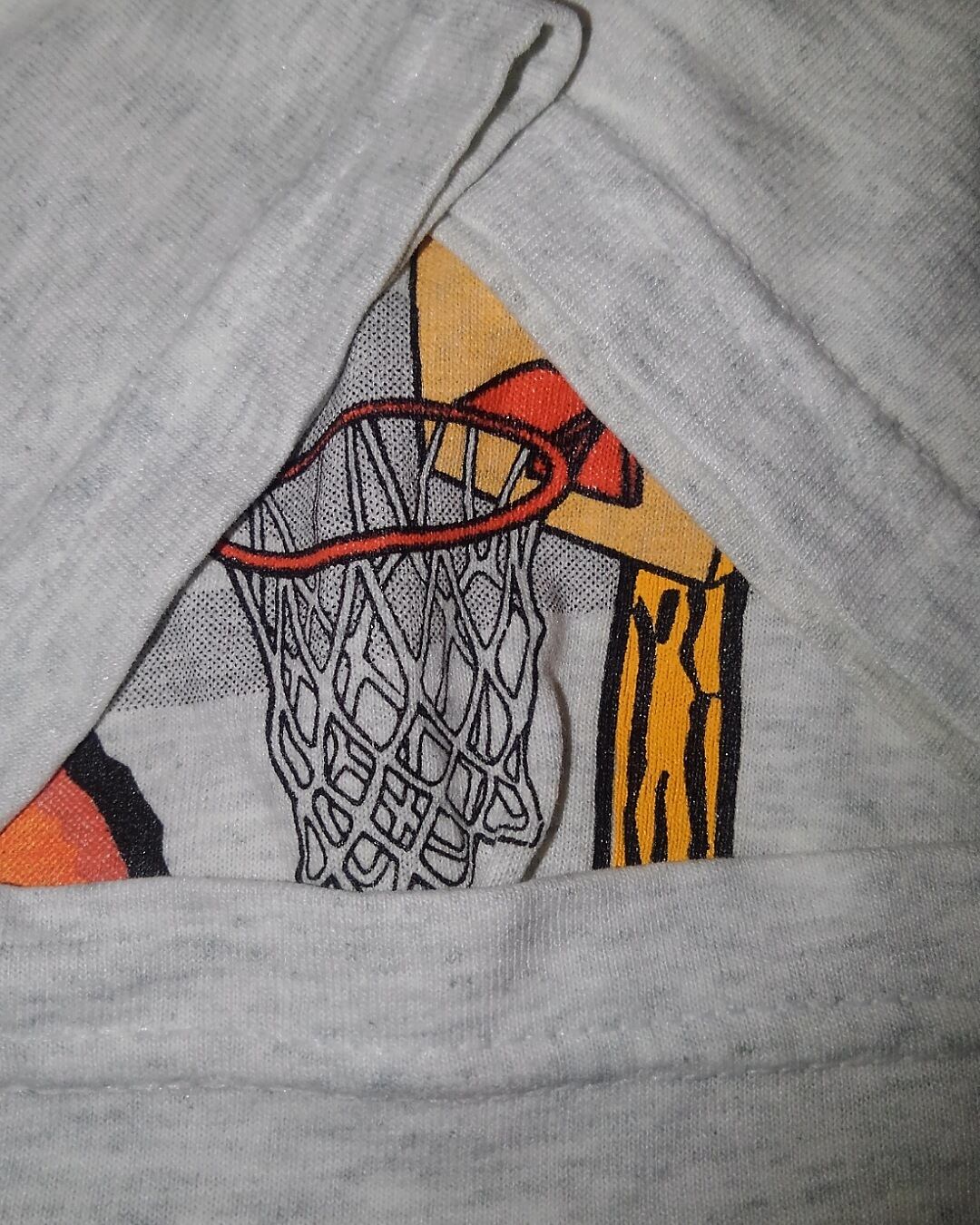 両面プリントでA面には大きくポップなデザインのバスケットボールとバックには