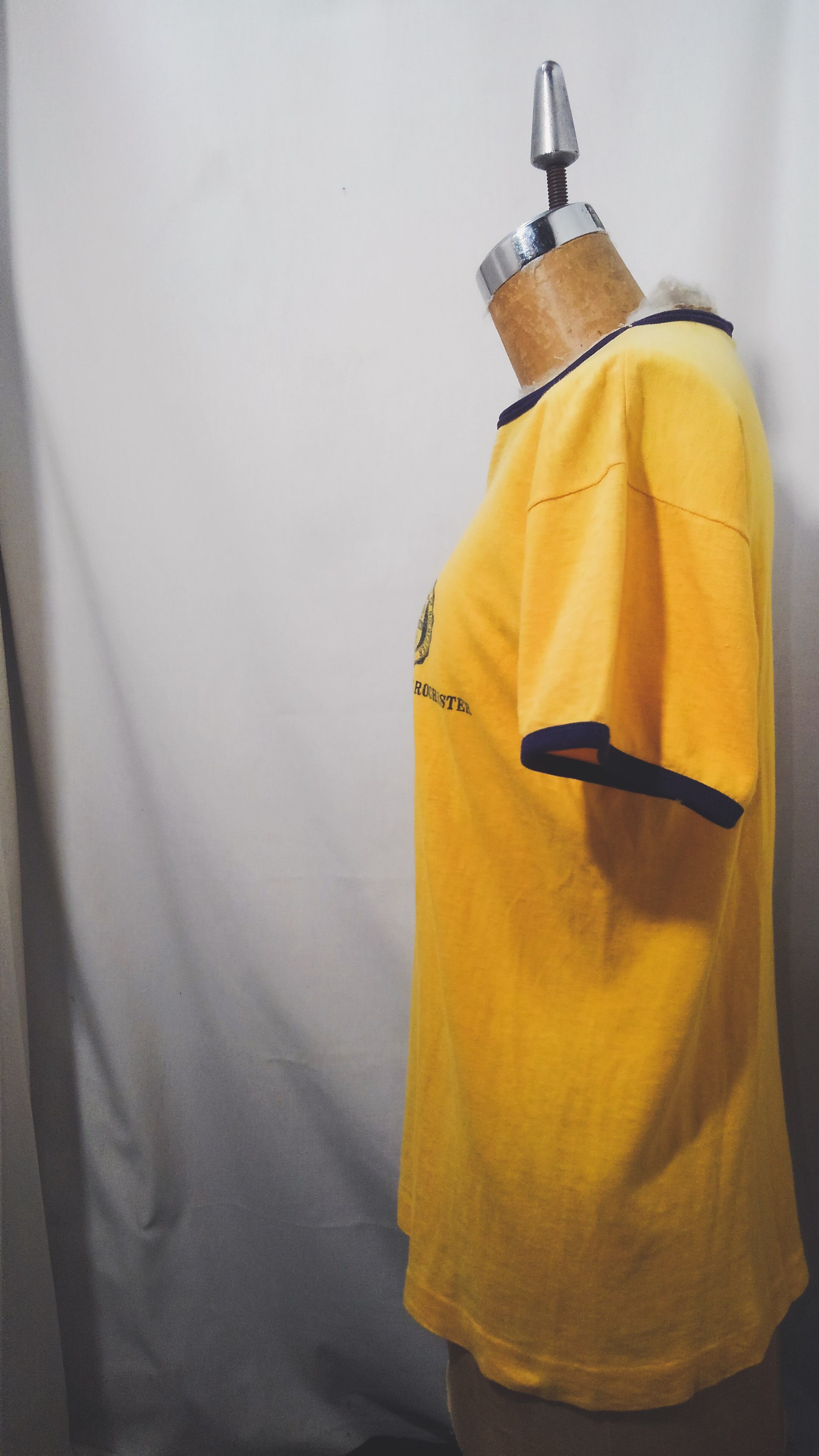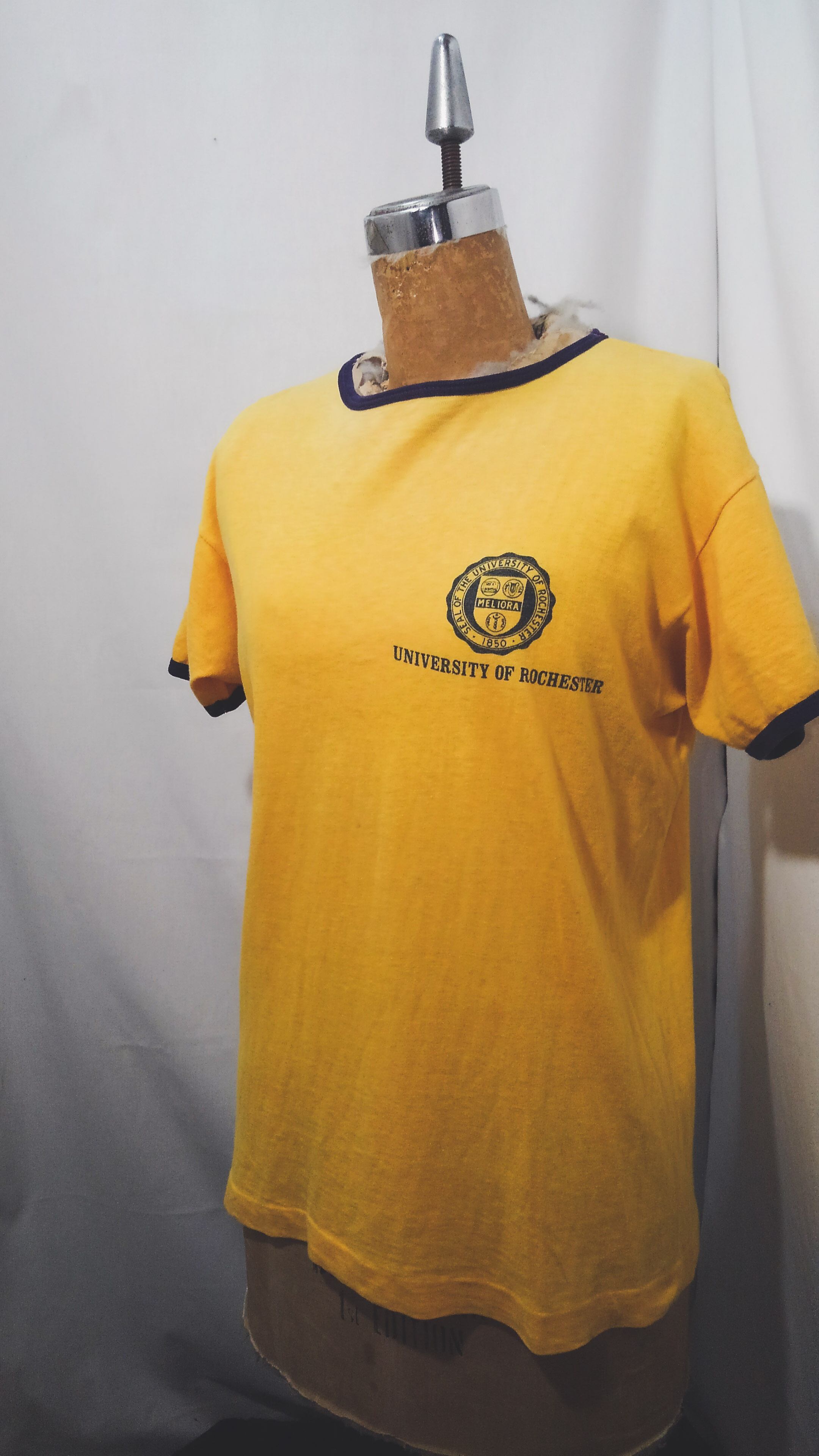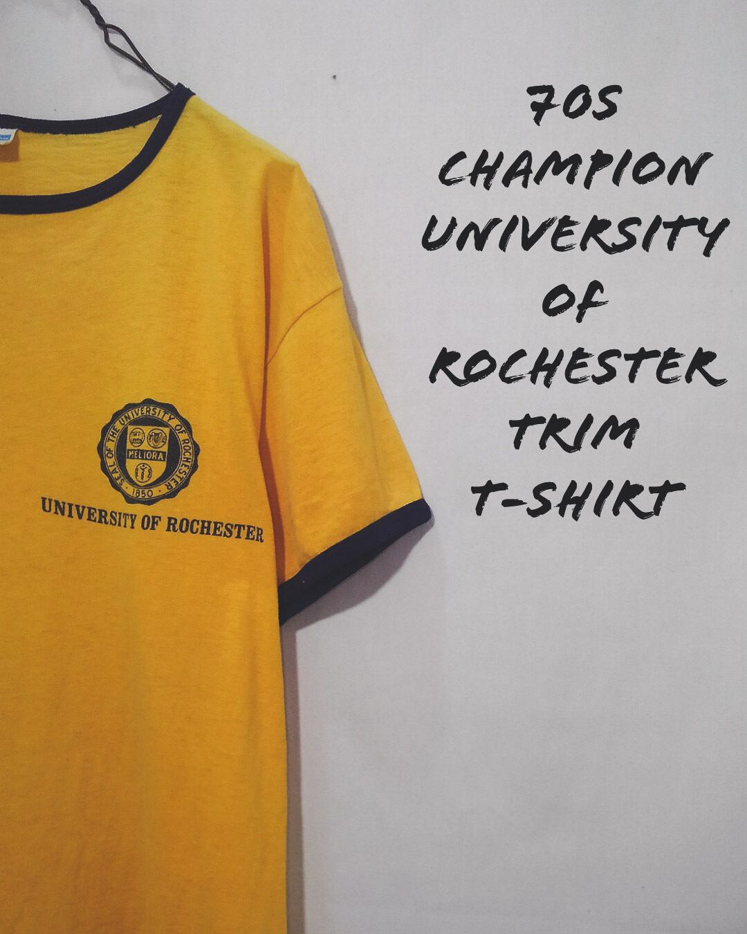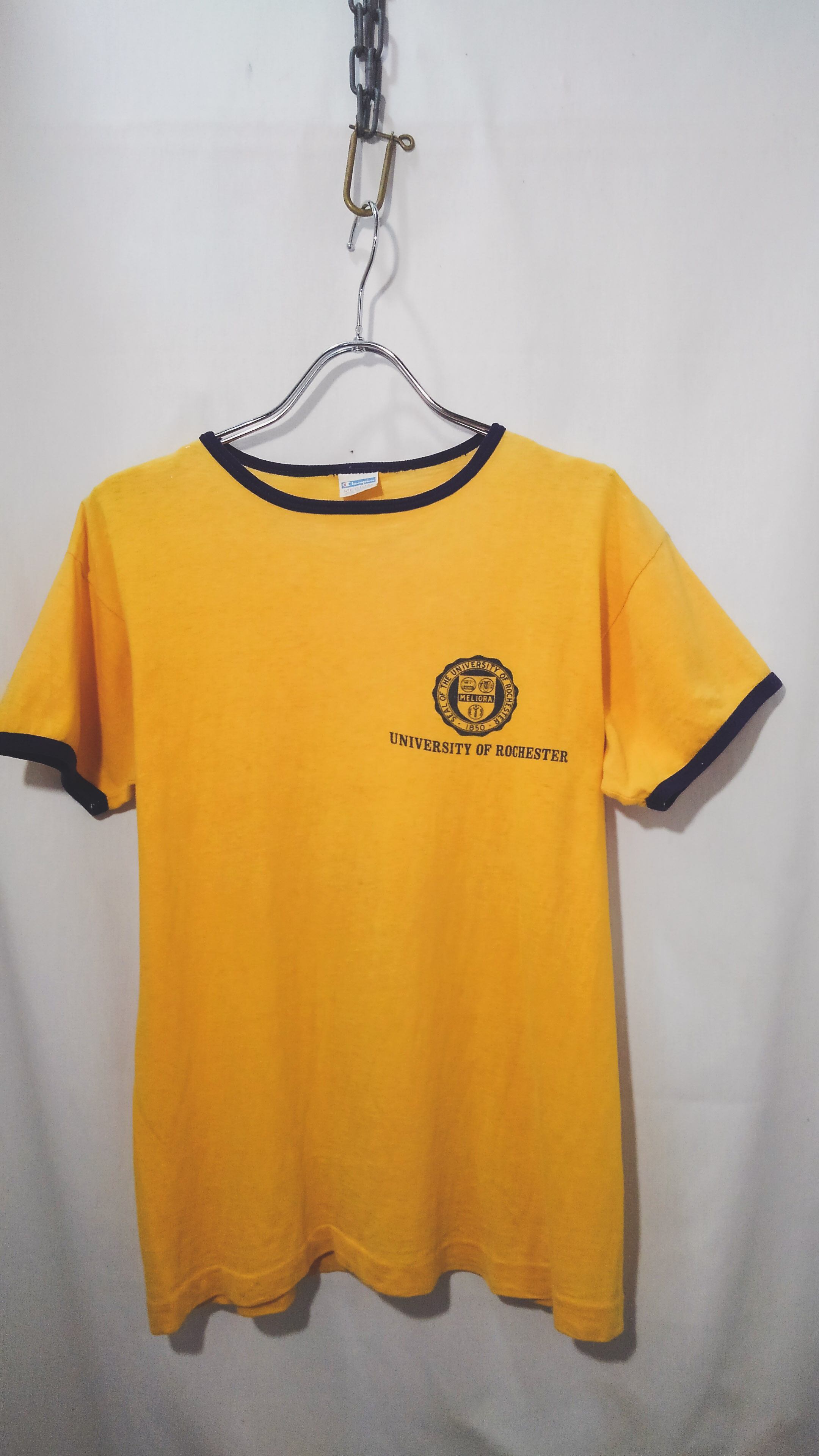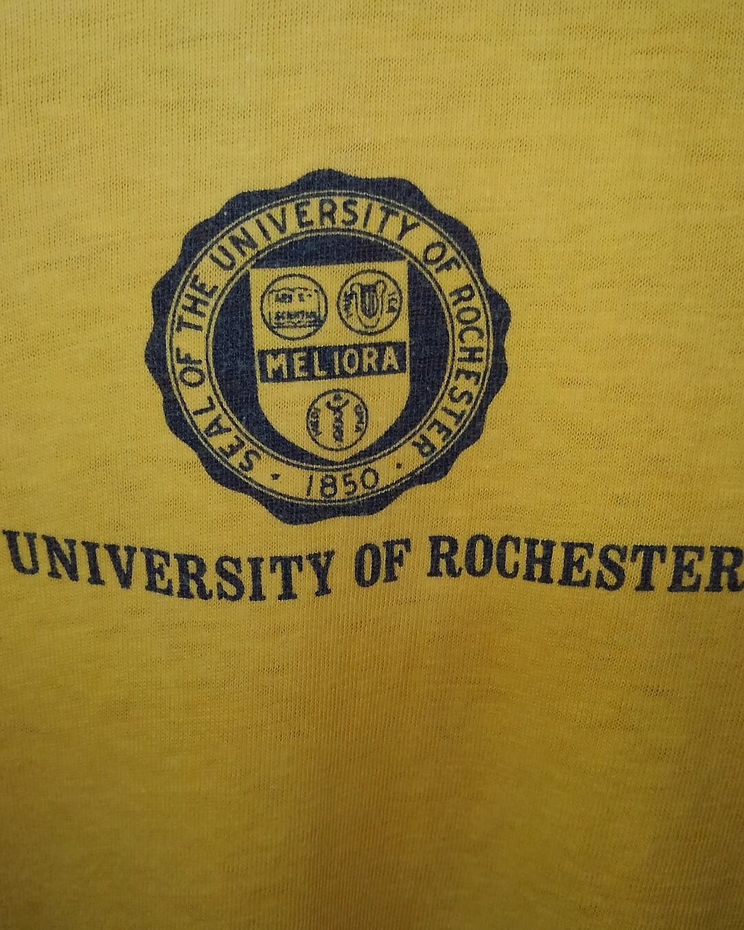 胸にはアメリカ ニューヨーク州にあるロチェスター大学のワンポイントロゴの入ったシンプルなカレッジTシャツ。