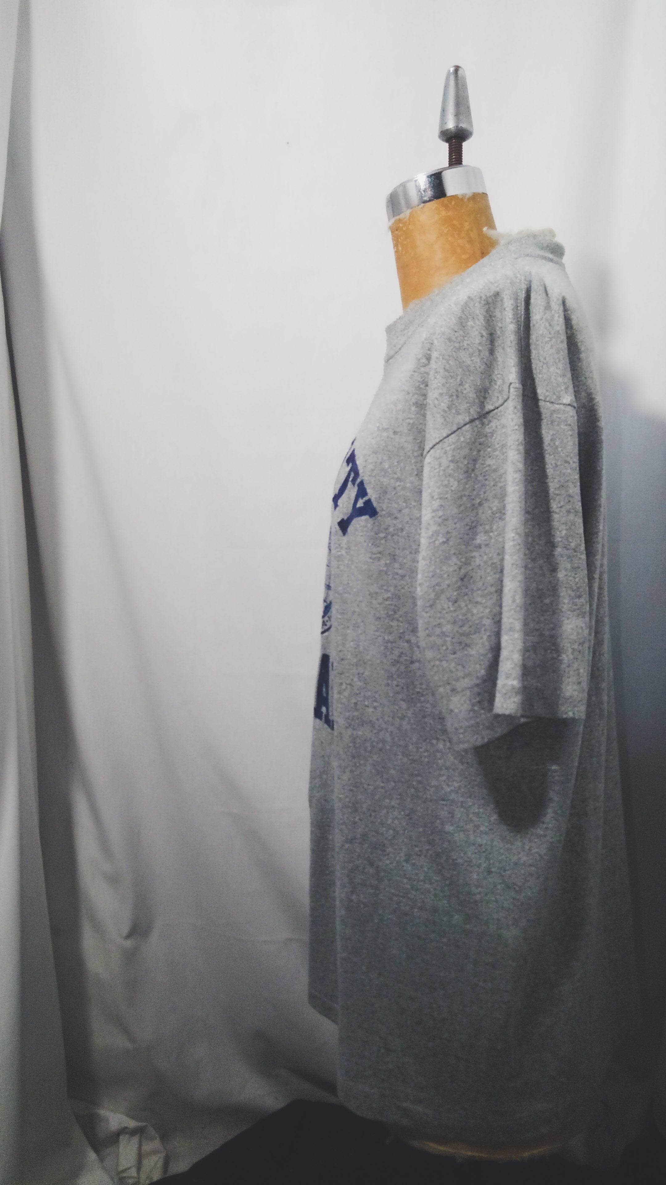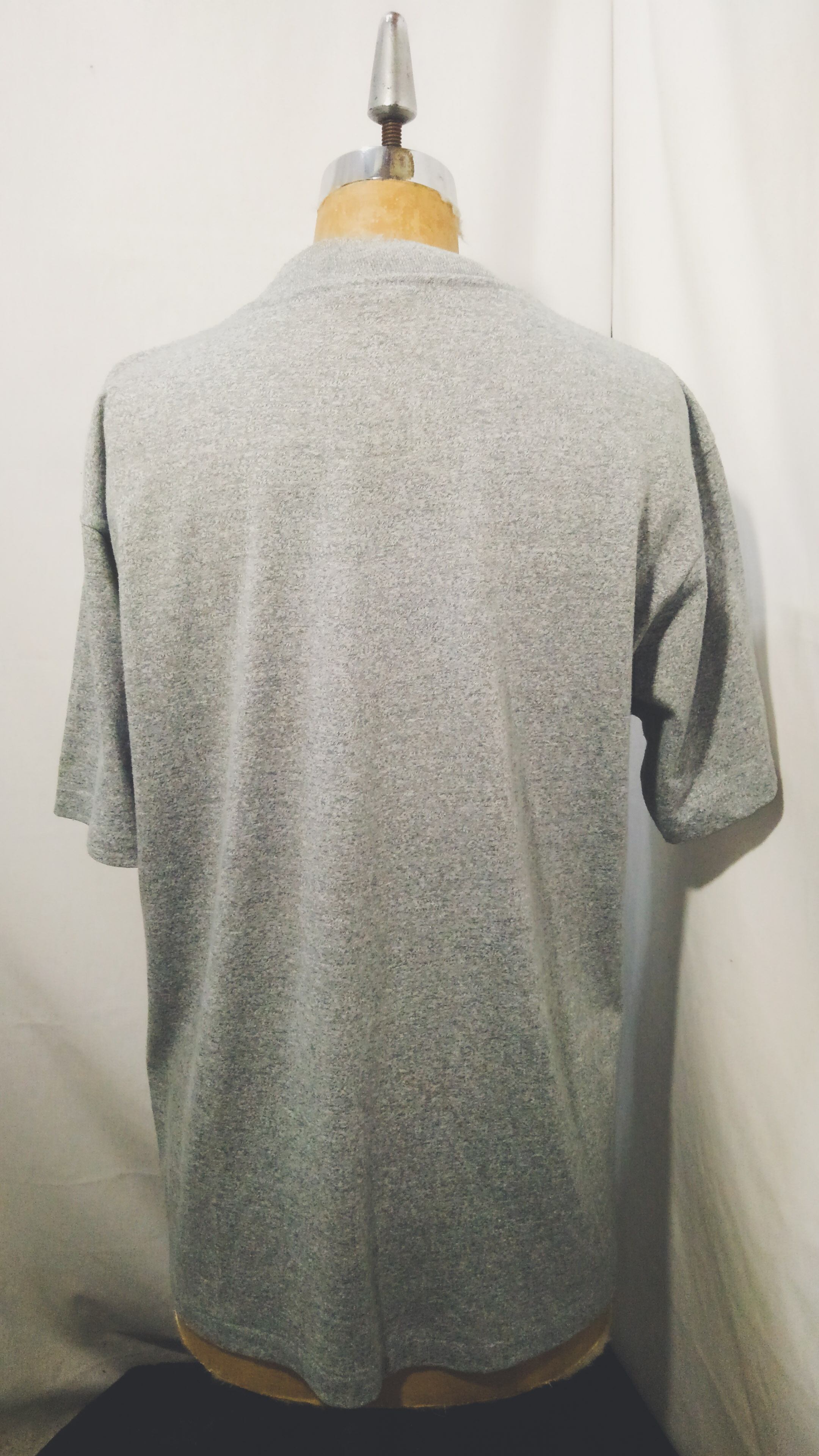 フロッキーの三段プリントでボディは杢グレー、袖裾共にシングルステッチの丸胴ボディ。
