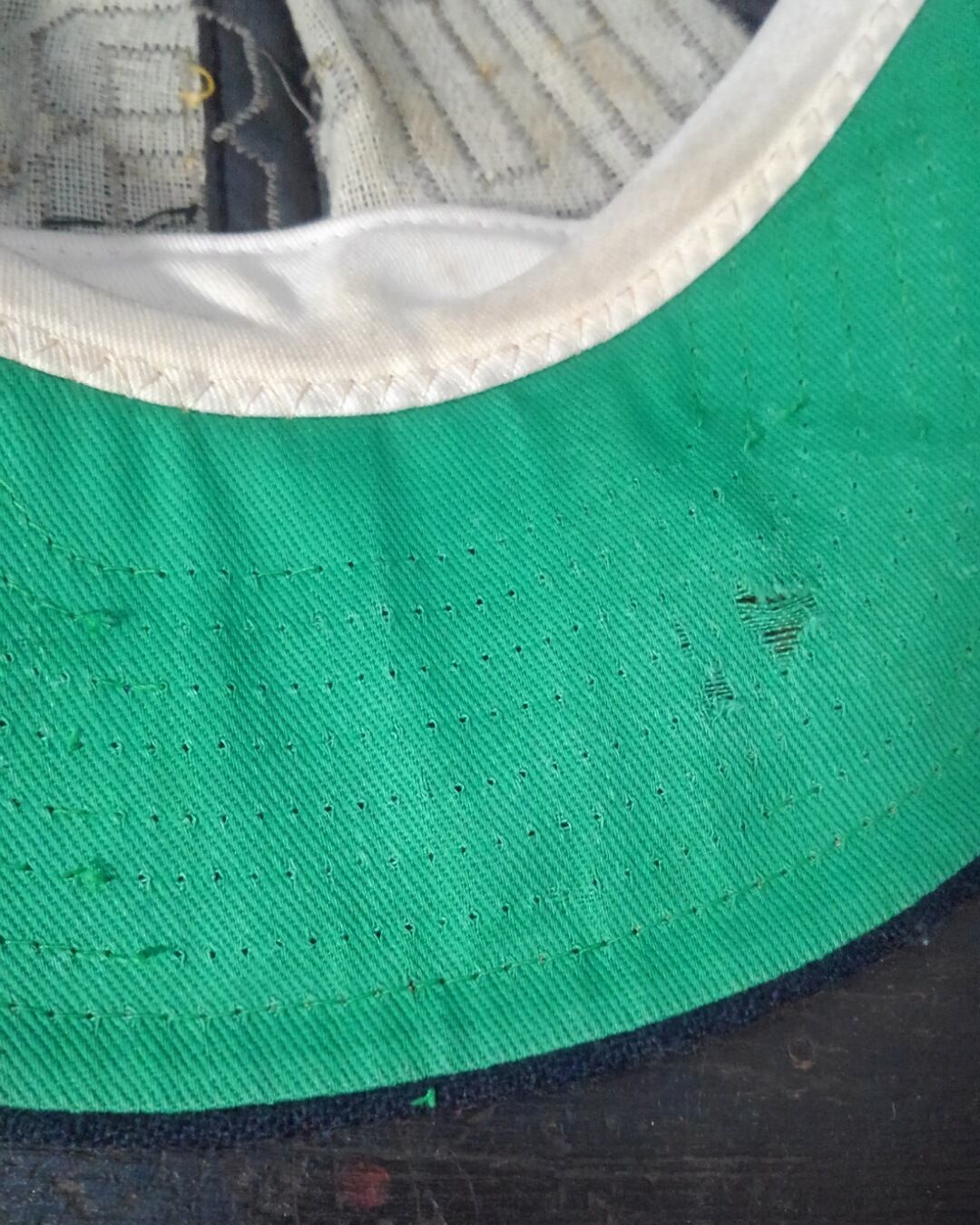 バイザーの中央辺りの芯が砕けている為、型崩れしていますが、根元がしっかり残っているので形状は保っています。(お好みによりますが、通常使用可能です)