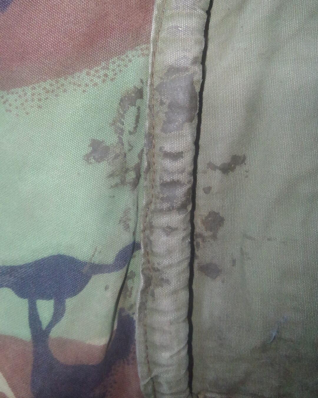 裏返すと防寒性を確保するため脛ぐらいまでコットンポプリンの様な生地で2重構造になっています。(一部破れアリ)