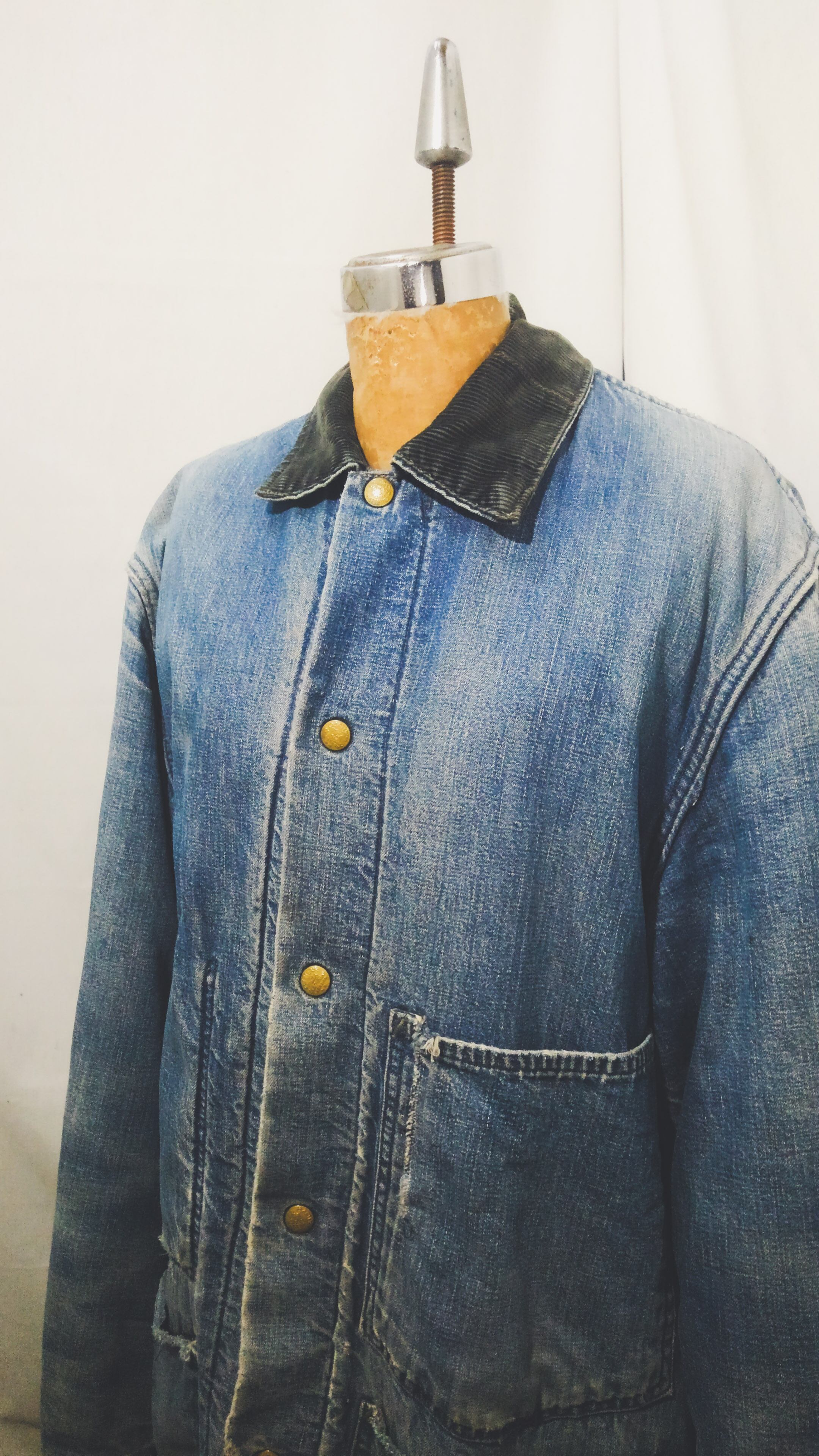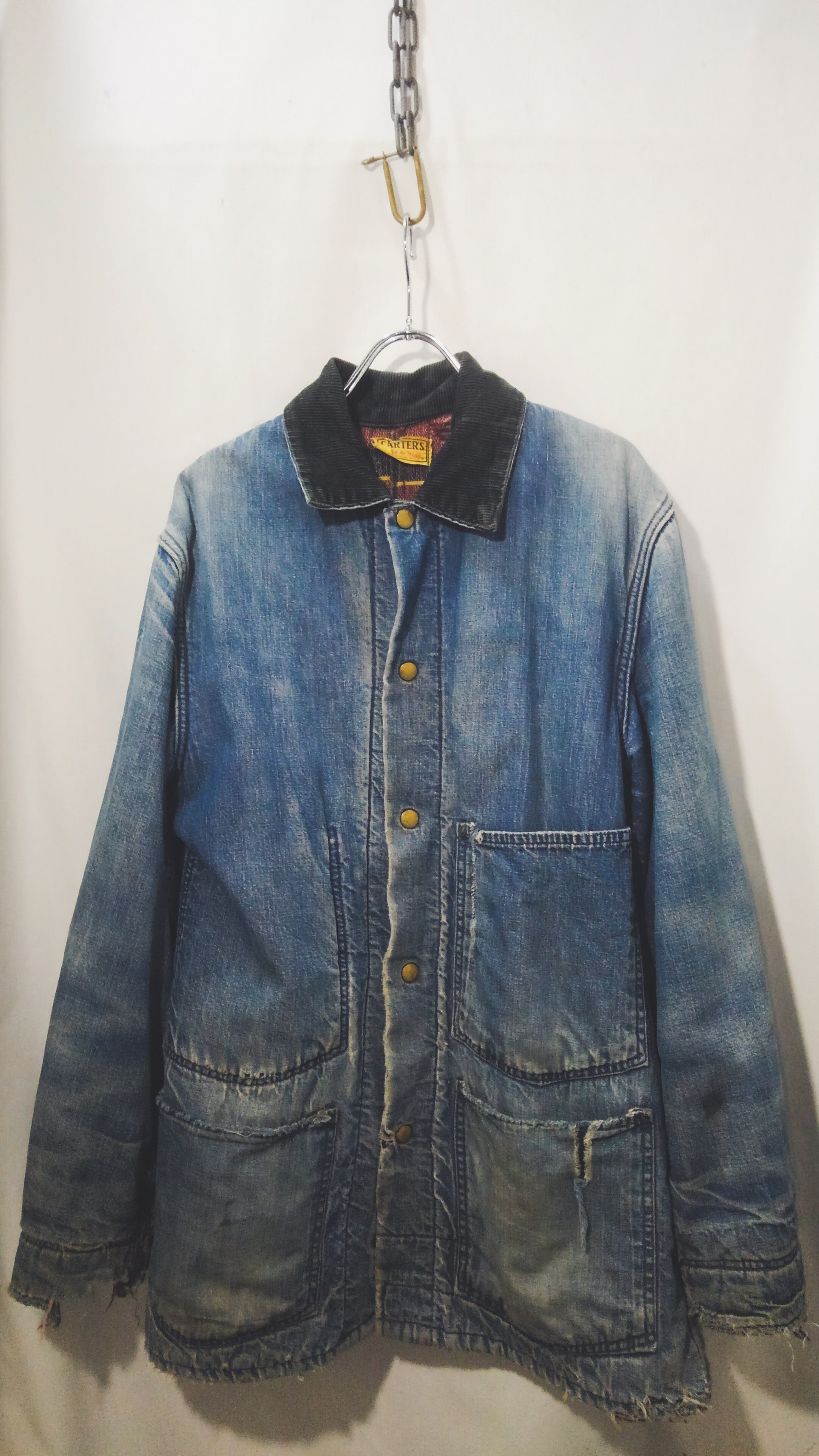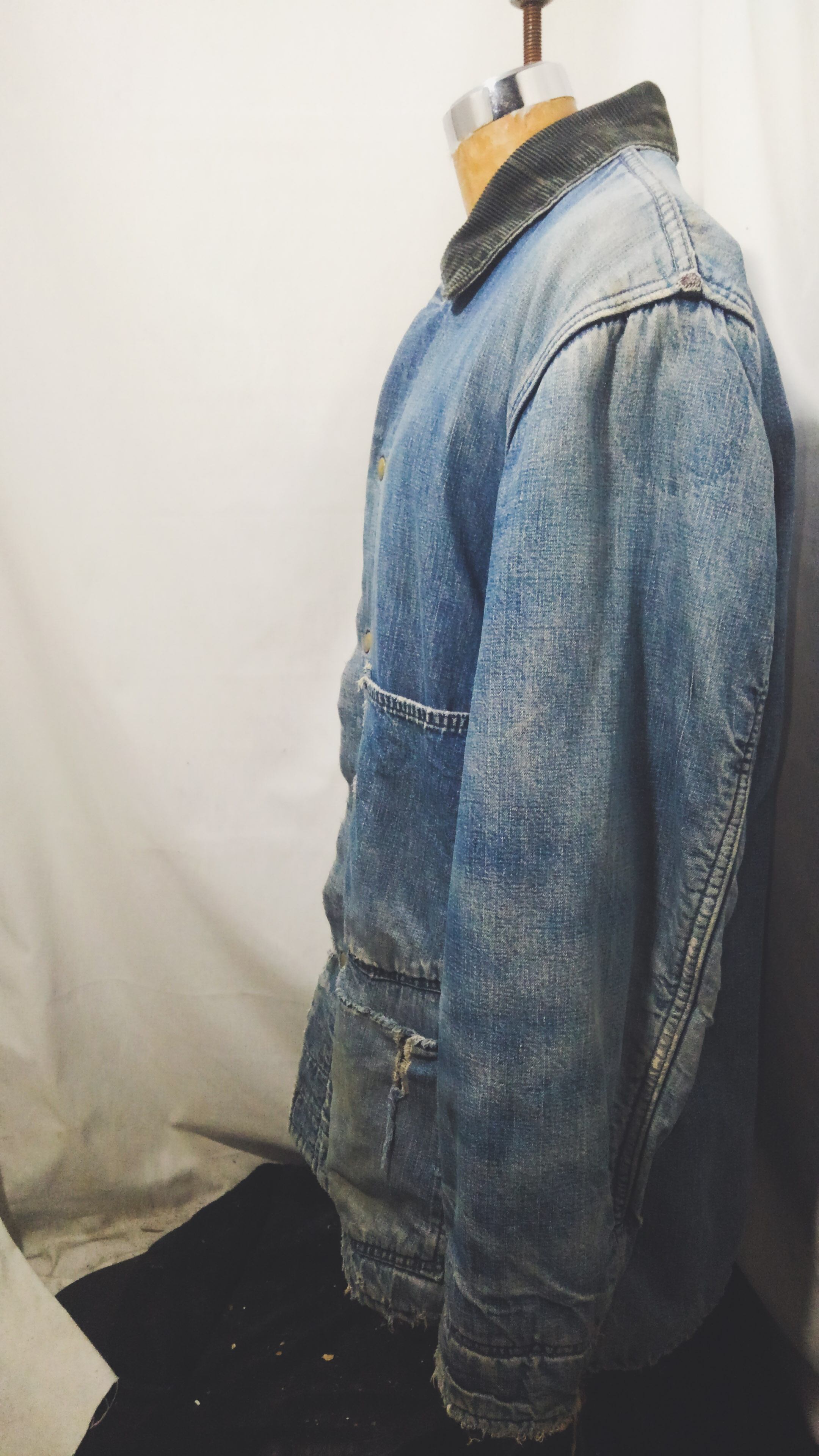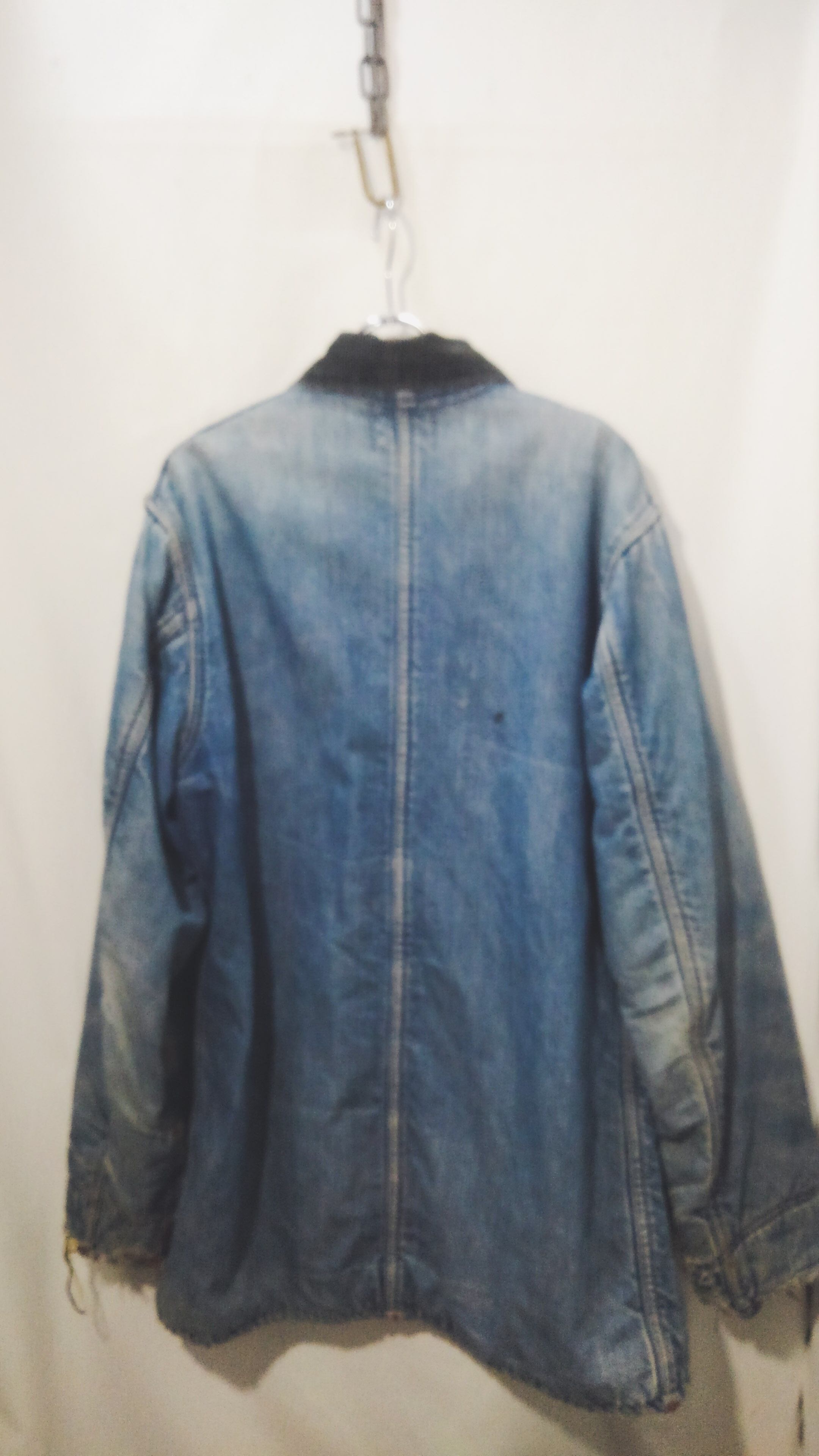 全体的にダメージがみられますが、それもワークウェアとしての能力を遺憾なく発揮した証で、色落ちしたインディゴとそのダメージは加工では到底作れない長年愛用され続けたその姿は美しく、「ボロ」とは言えども着用困難なレベルではない、「ほどよくボロ」こんな言葉がピッタリな個体です。