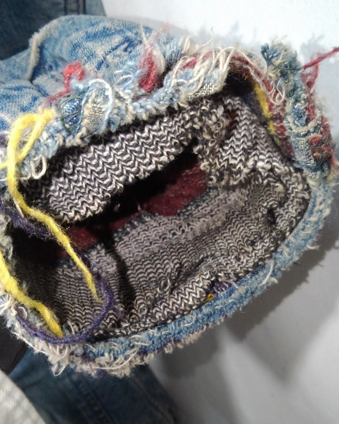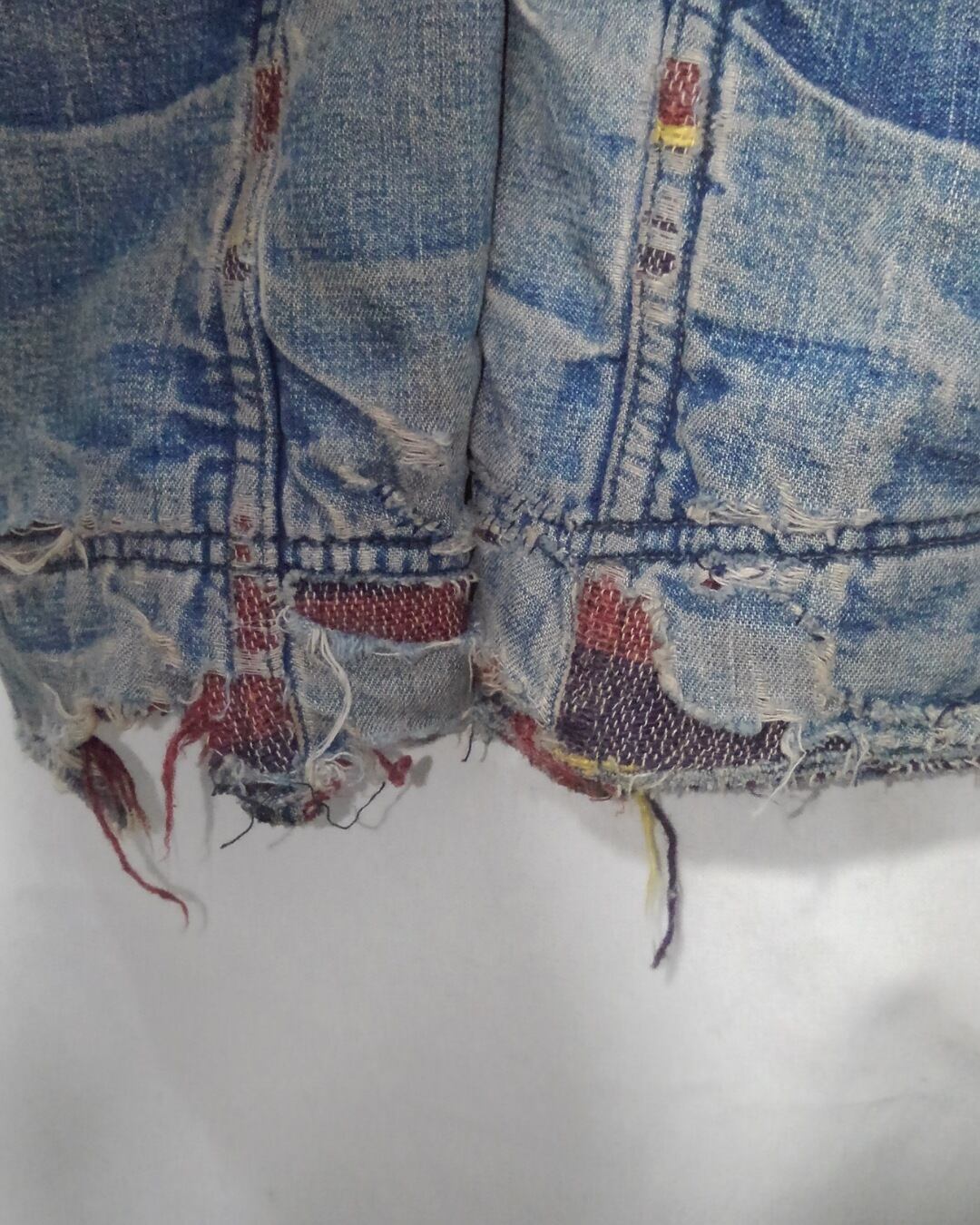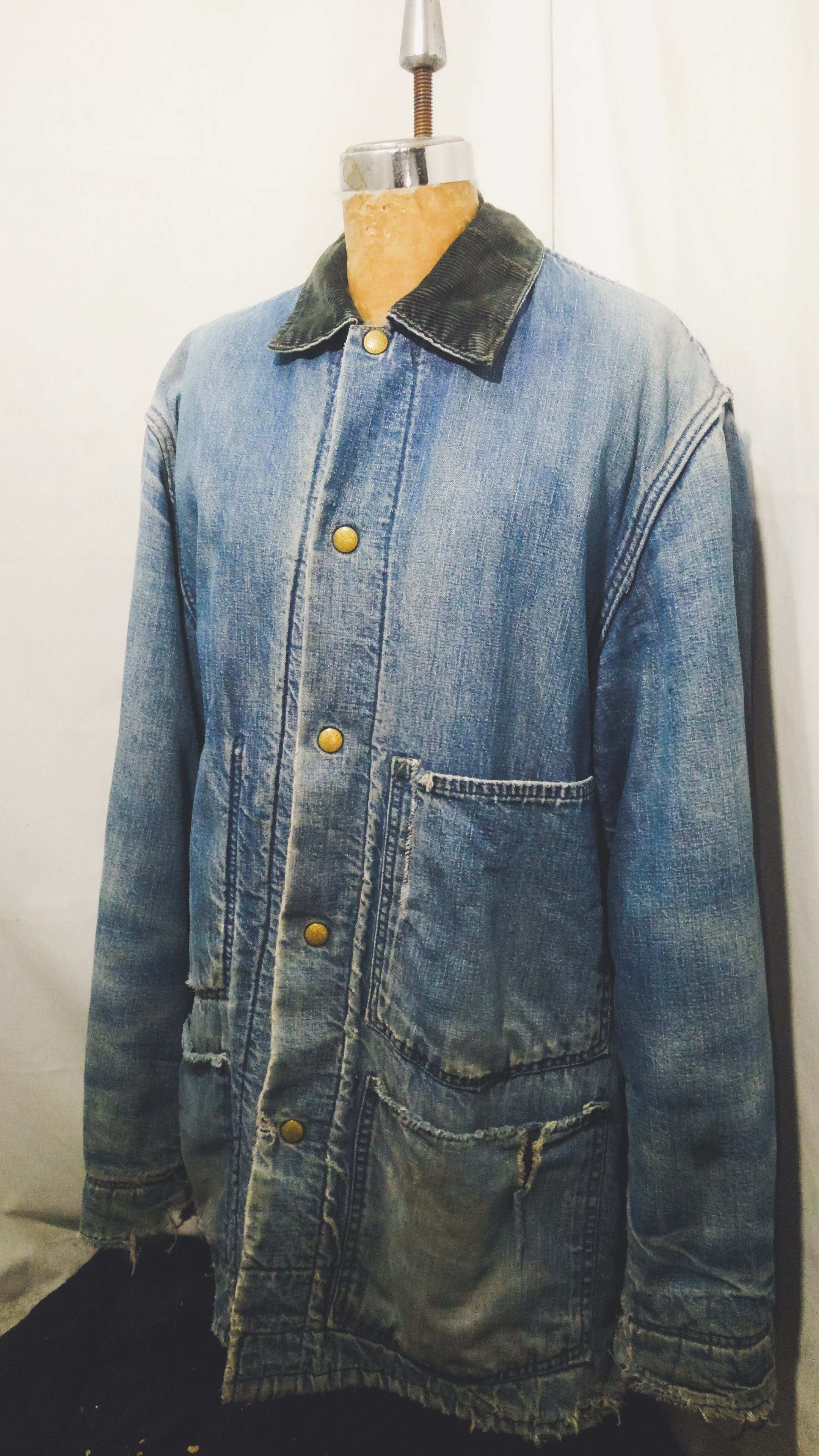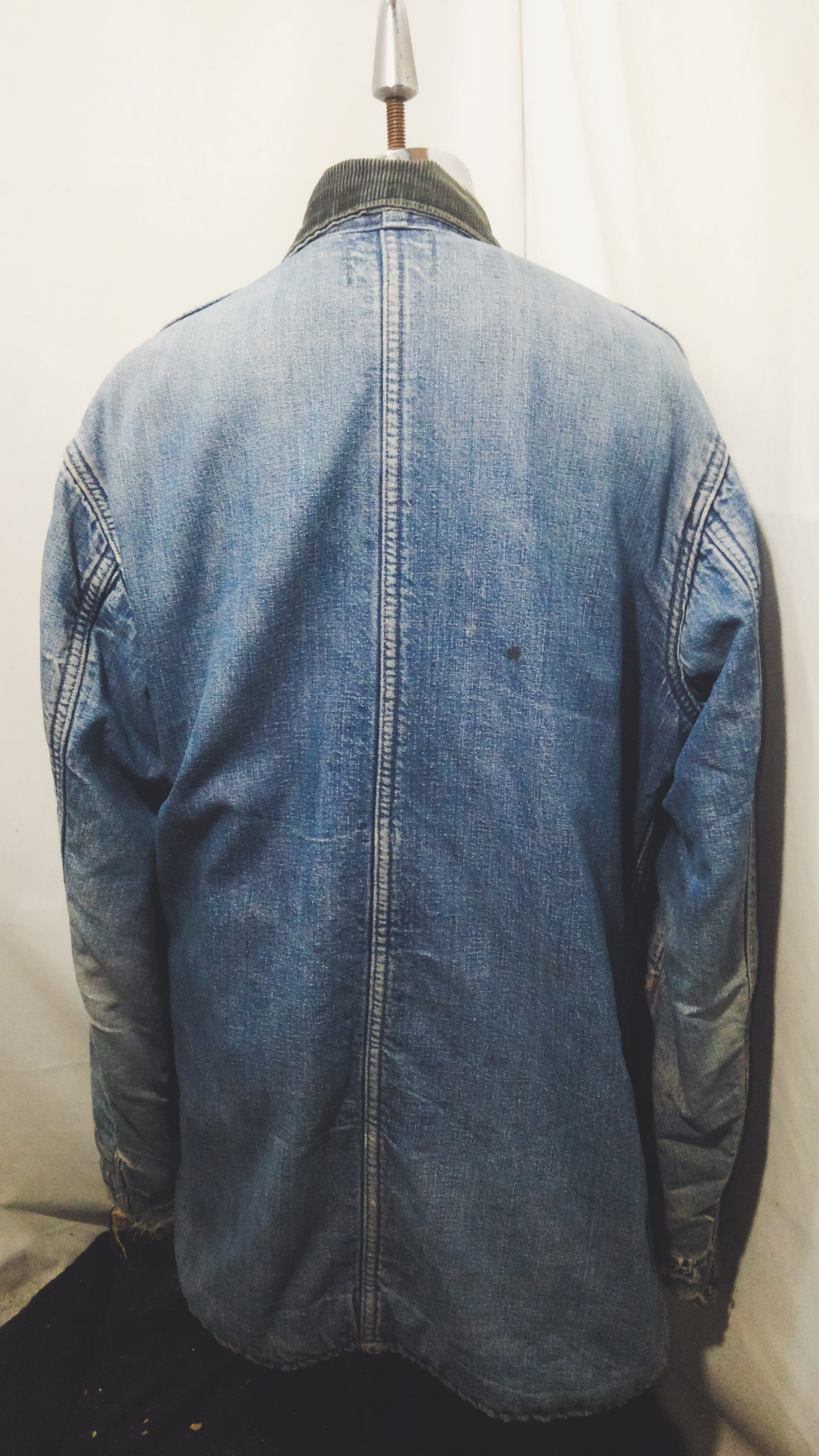 全体的にダメージがみられますが、それもワークウェアとしての能力を遺憾なく発揮した証で、色落ちしたインディゴとそのダメージは加工では到底作れない長年愛用され続けたその姿は美しく、「ボロ」とは言えども着用困難なレベルではない、「ほどよくボロ」こんな言葉がピッタリな個体です。
