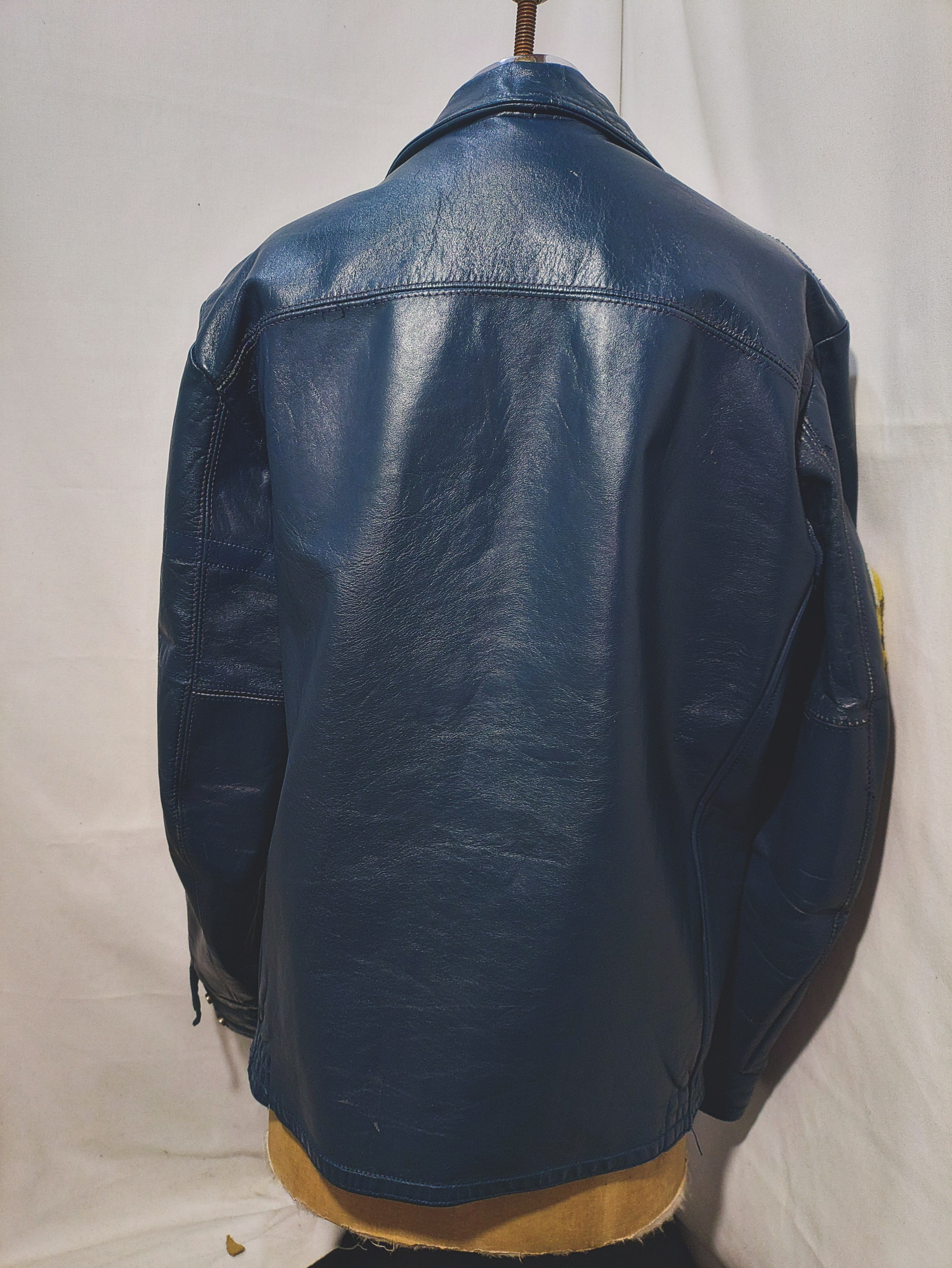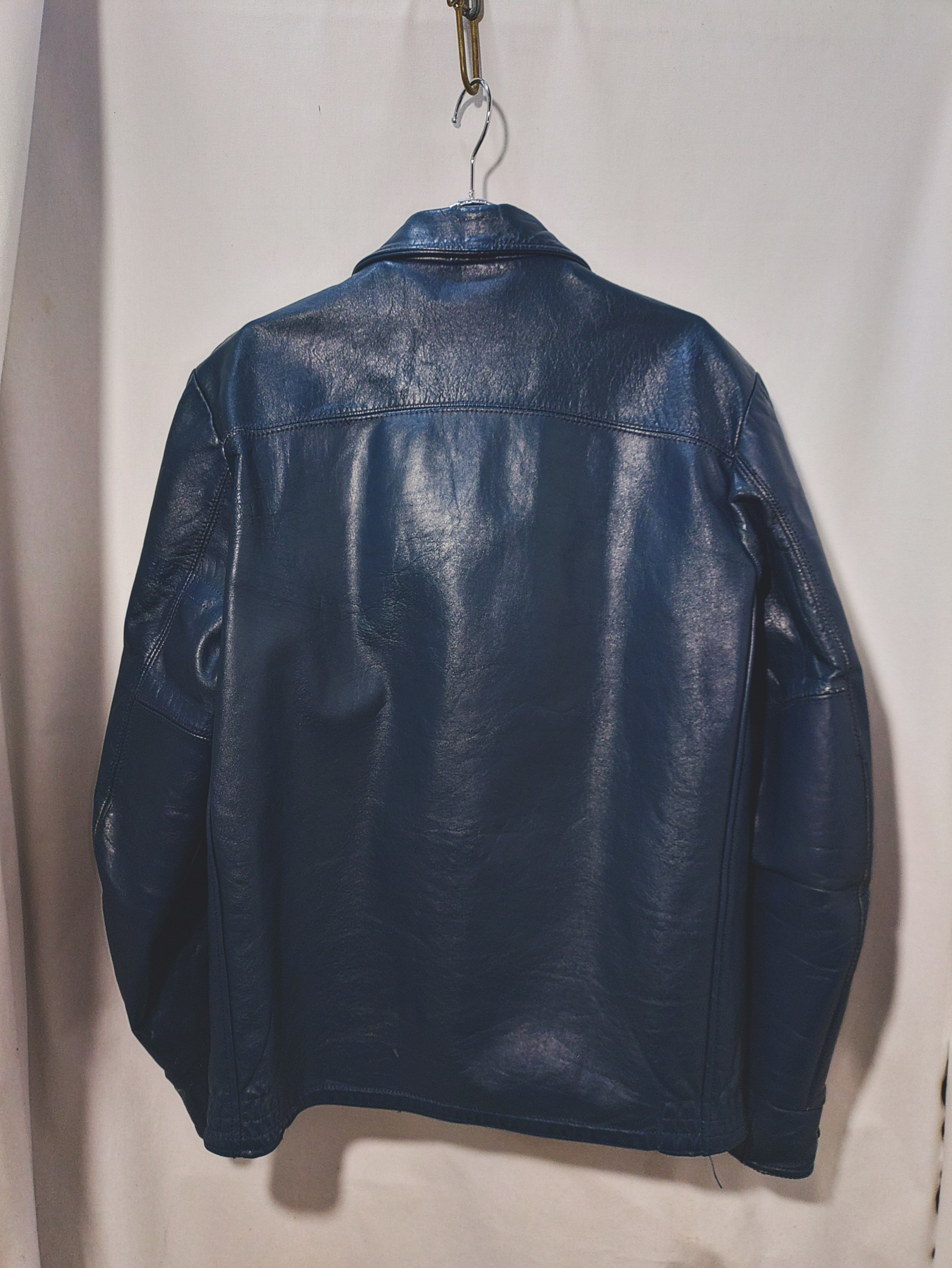 深みのあるネイビーの襟付きレザージャケットで全てレザー仕様。