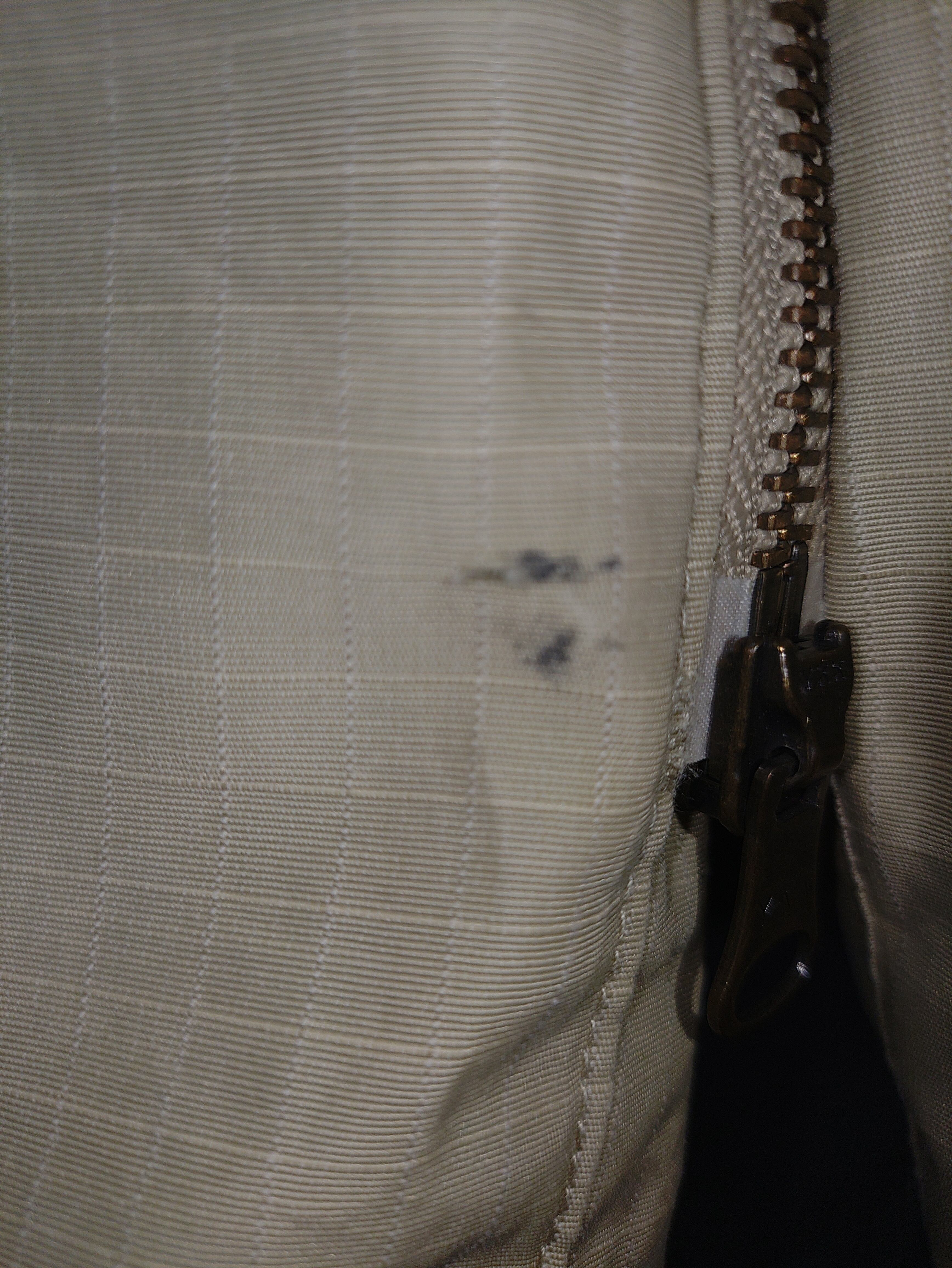 右肩付近とジップ下辺りに小さな黒染みがあり、ちょっとした薄汚れもございますが、特に目立った感じではなく、特別大きなダメージもありませんので日常使いに問題はないかと思われます。