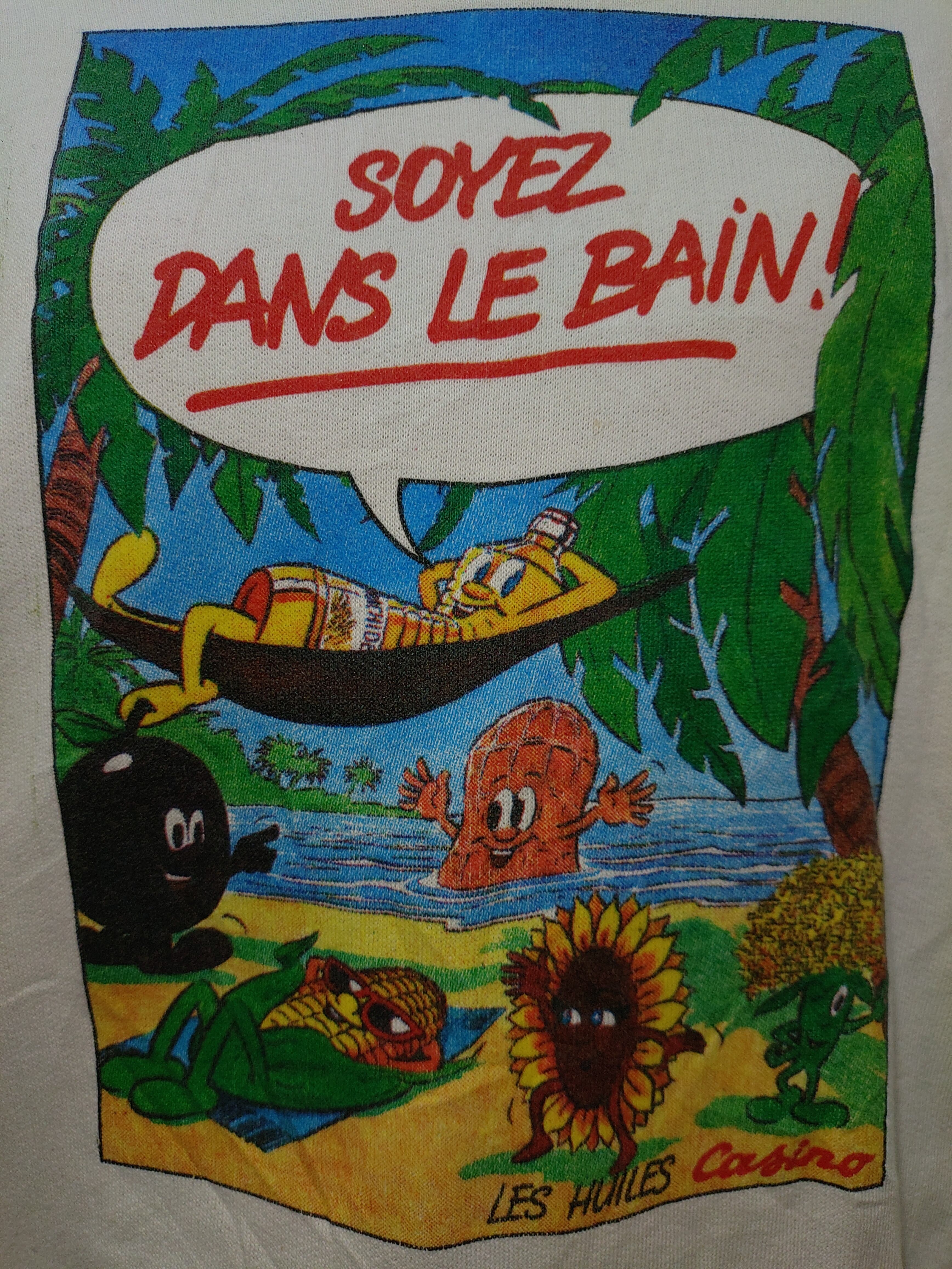 欧米らしいキャラクターデザインでプリントの吹き出し部分には「soyez dans le bain !」とあり、直訳すると「入浴中!」と言った意味だと思われますが、商品との関連性・詳細は不明です。