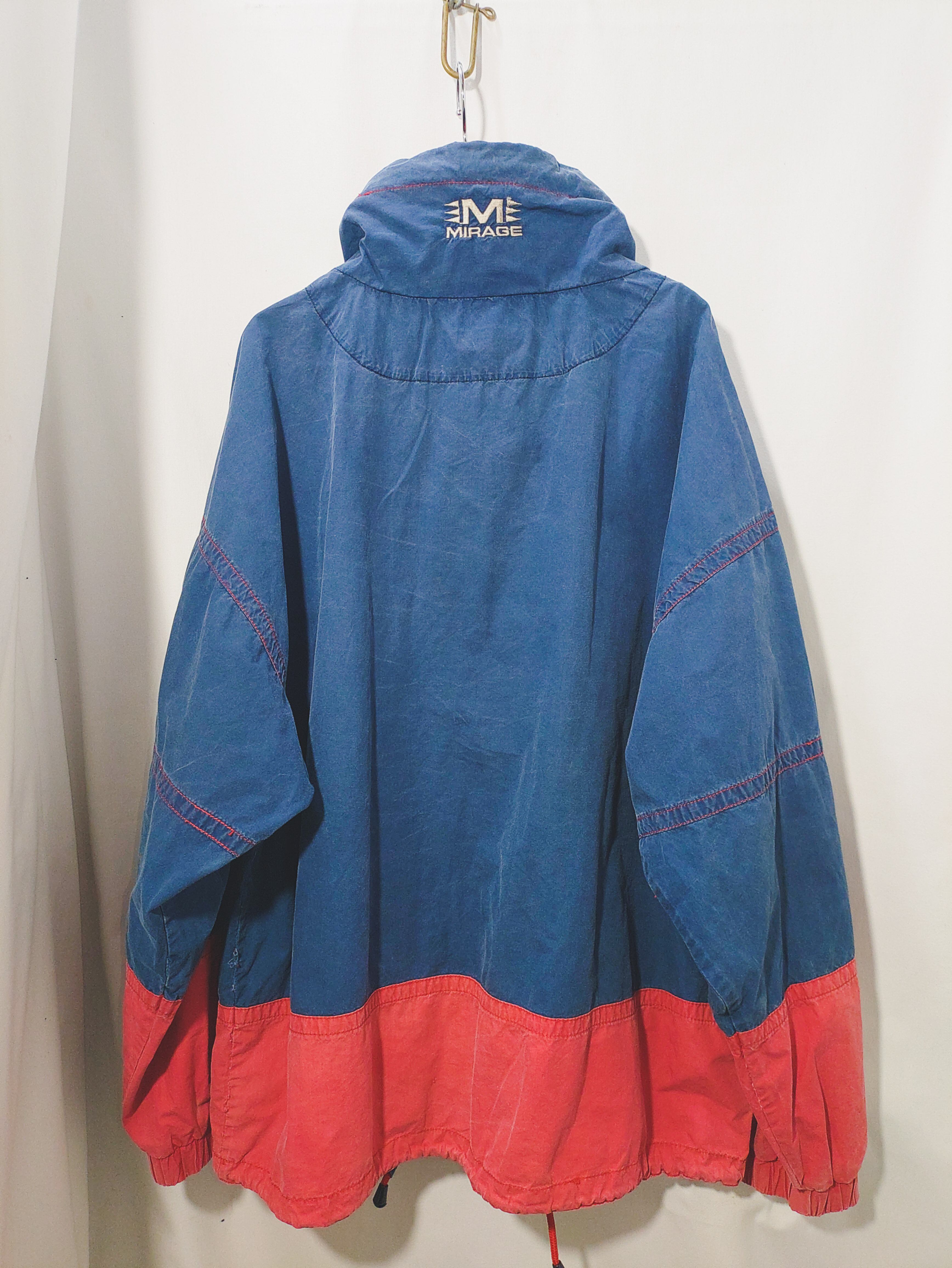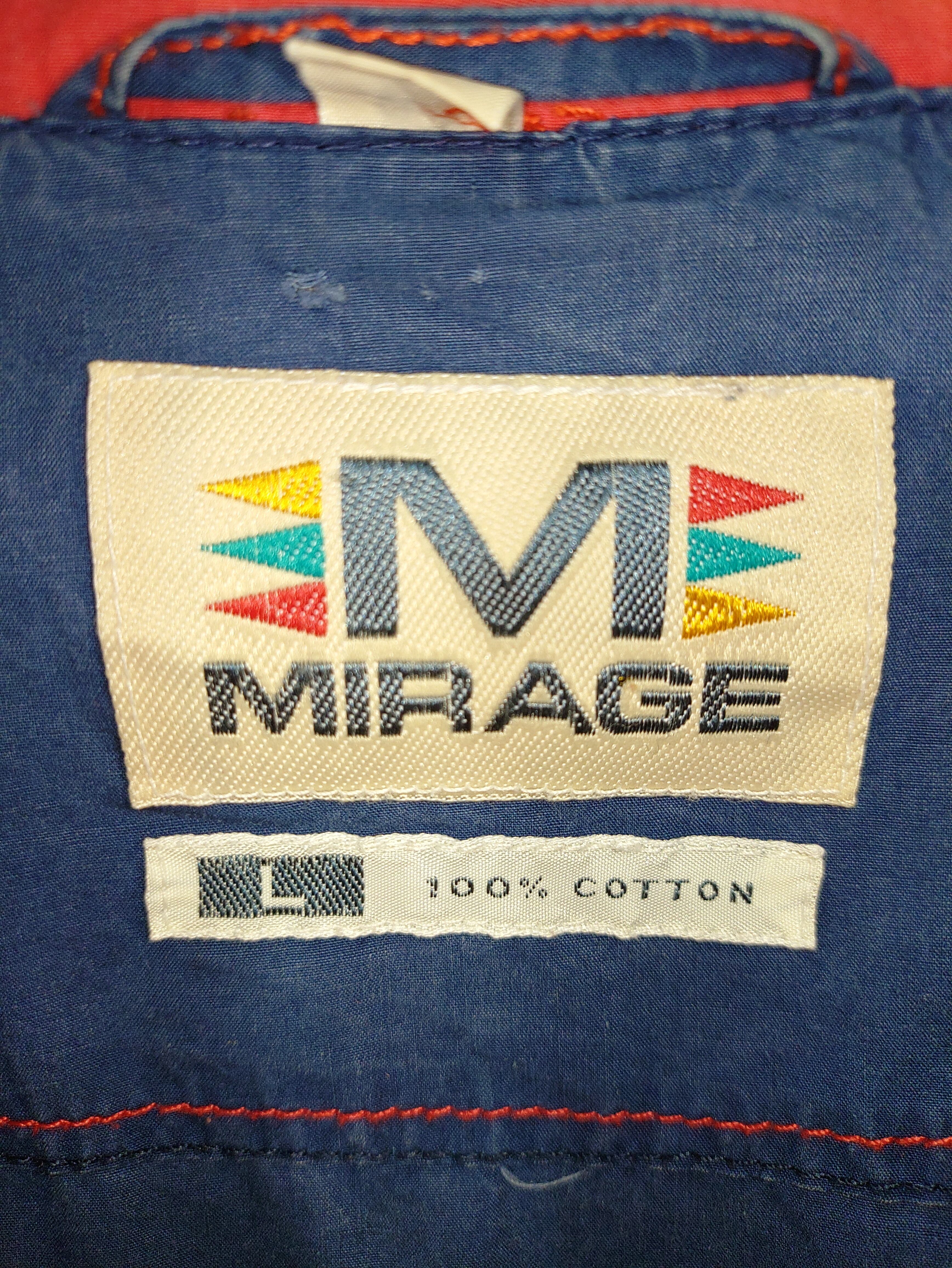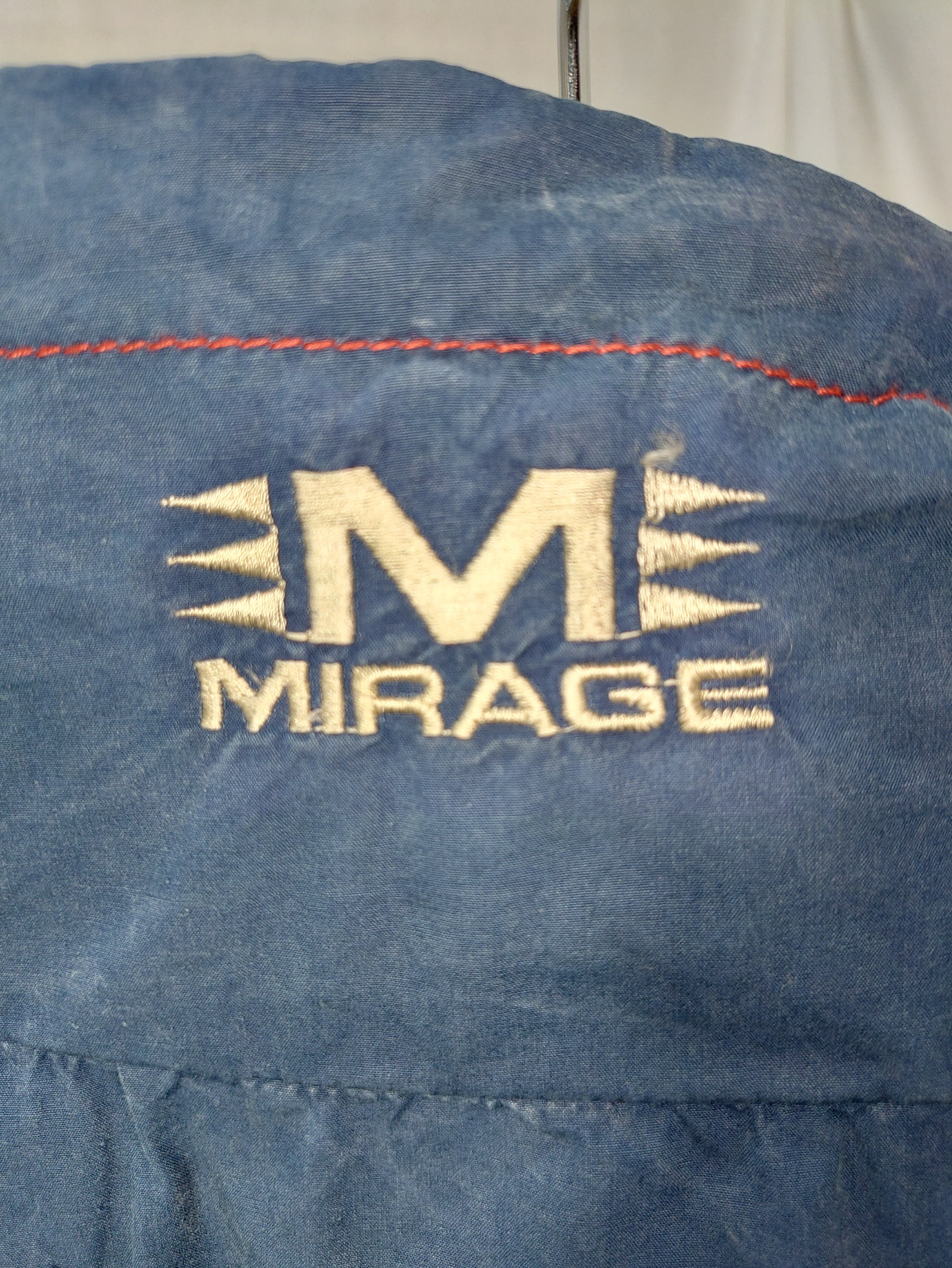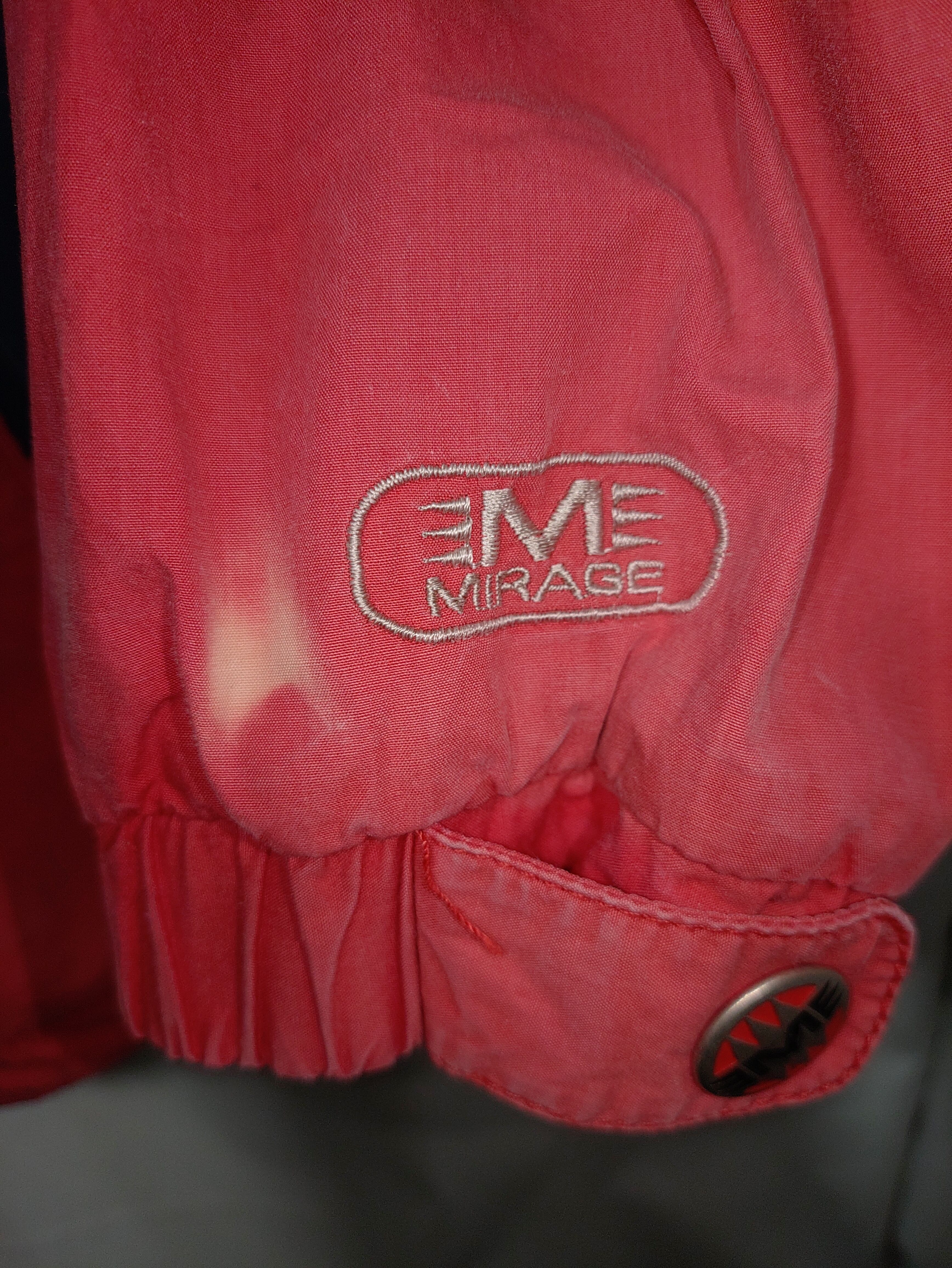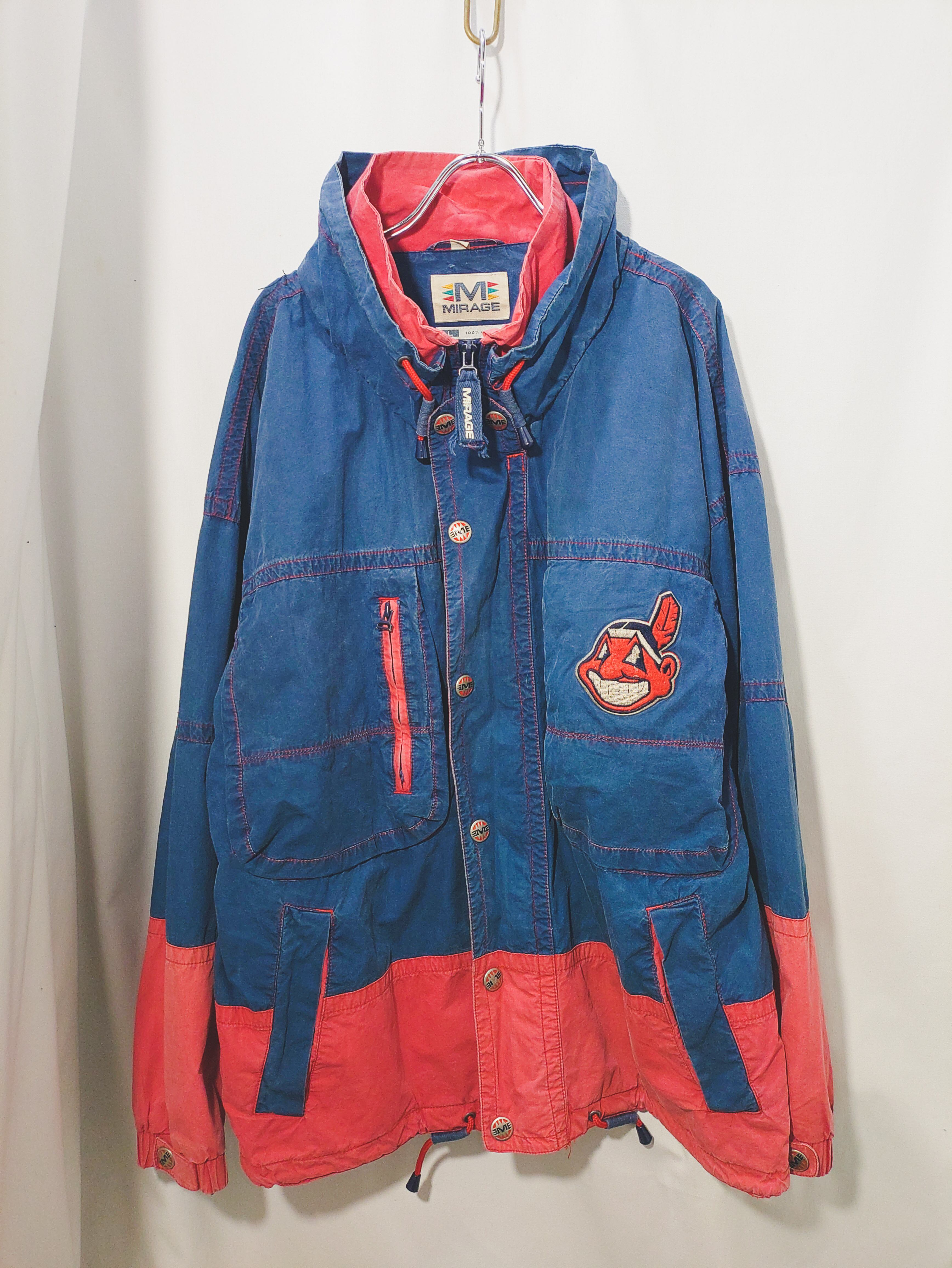 チームカラーであるネイビー×レッドをベースとしボディに左胸にはインディアンスのマスコットキャラクターの「ワフー酋長」のワッペンが付き、フロントはジップとボタンの比翼仕立ての二重構造、大きめのスナップボタンにはミラージュのブランドロゴが入っています。