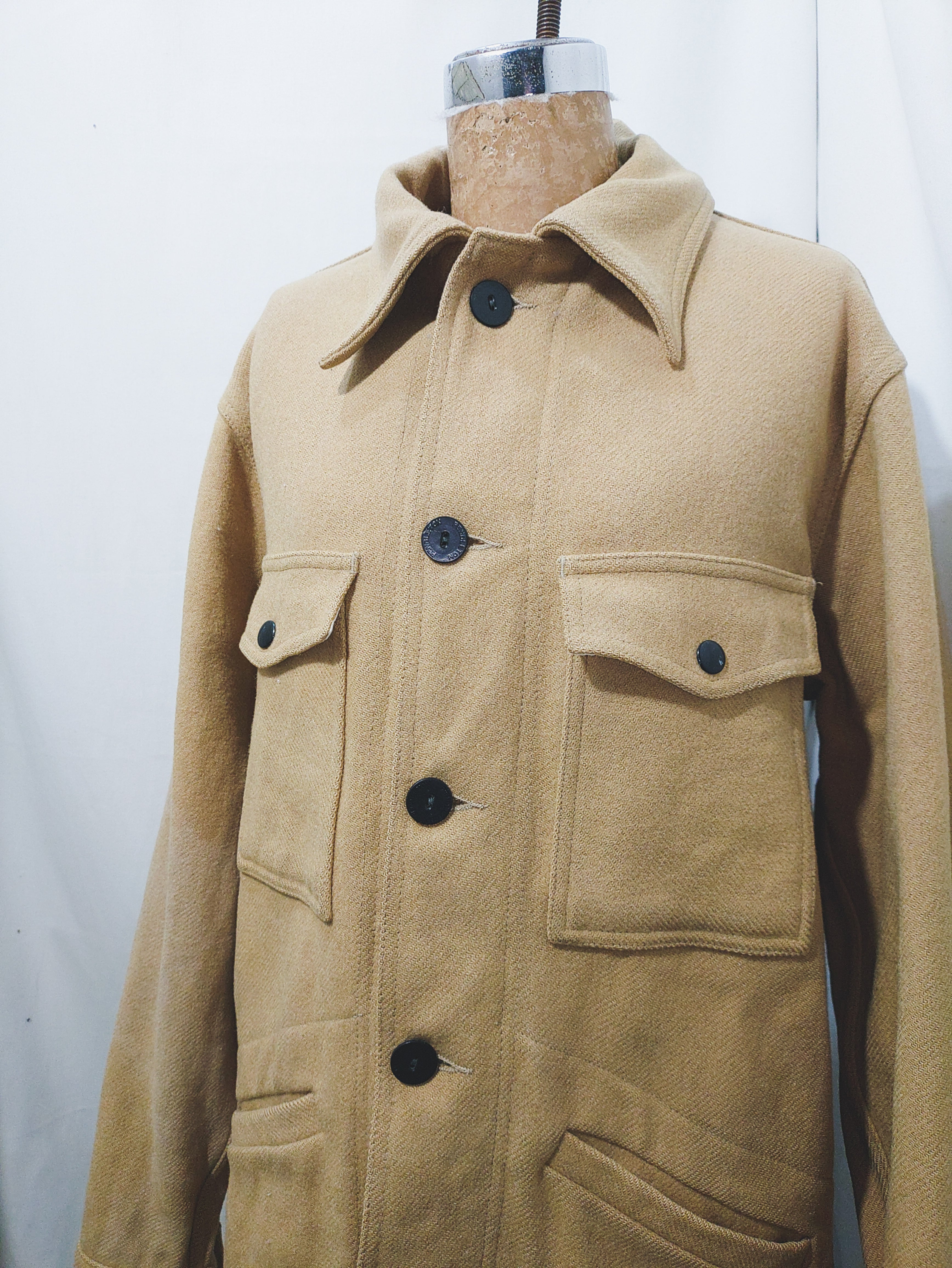 両胸にフラップポケット、腹部の両サイドにハンドウォーマーポケットの4ポケが付いたサファリジャケットの様な形で生地感や縫製は流石の一言。