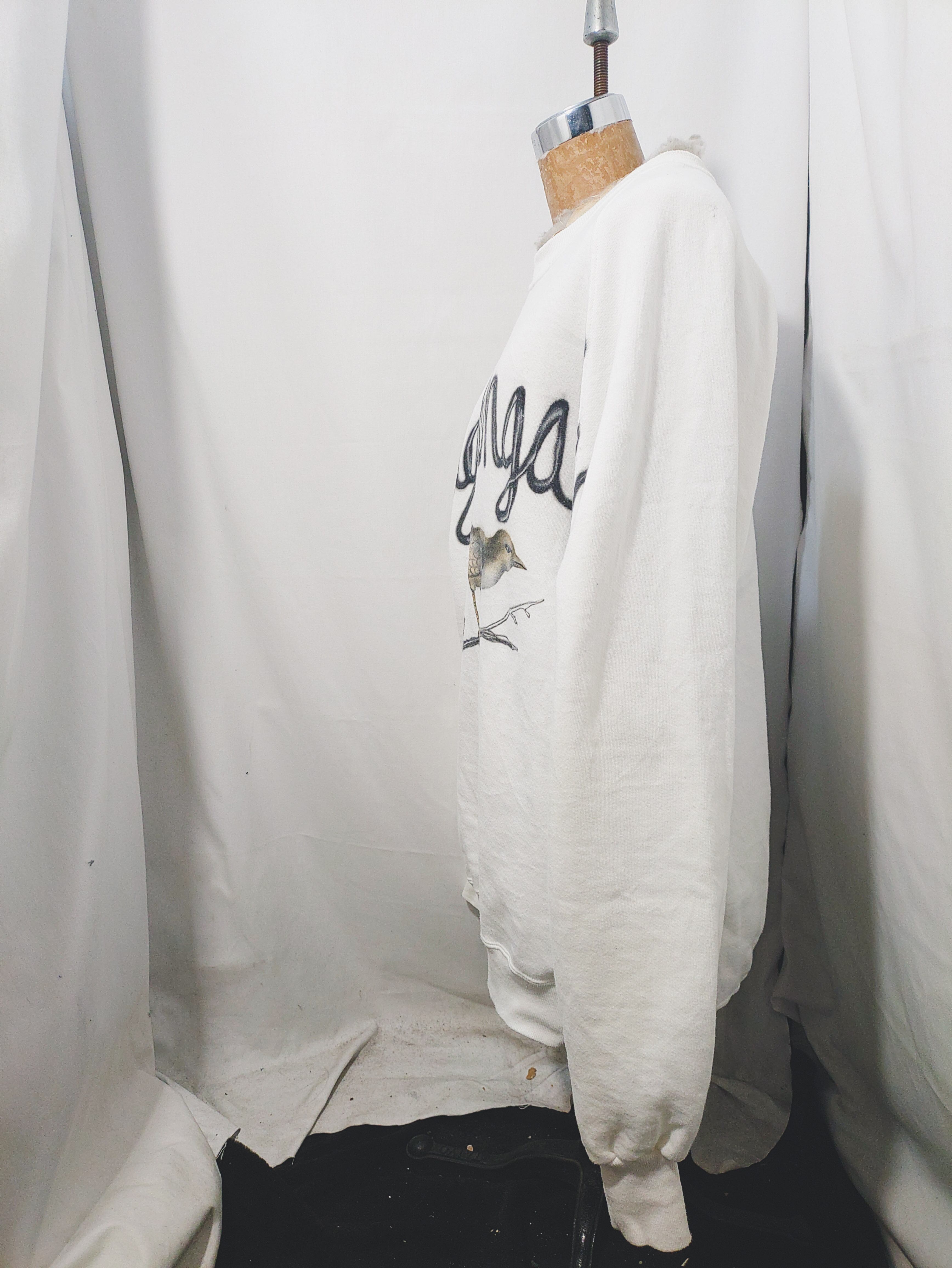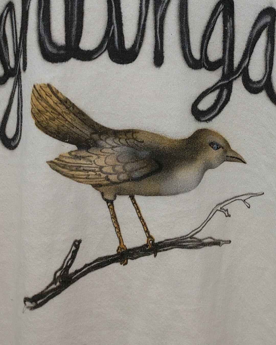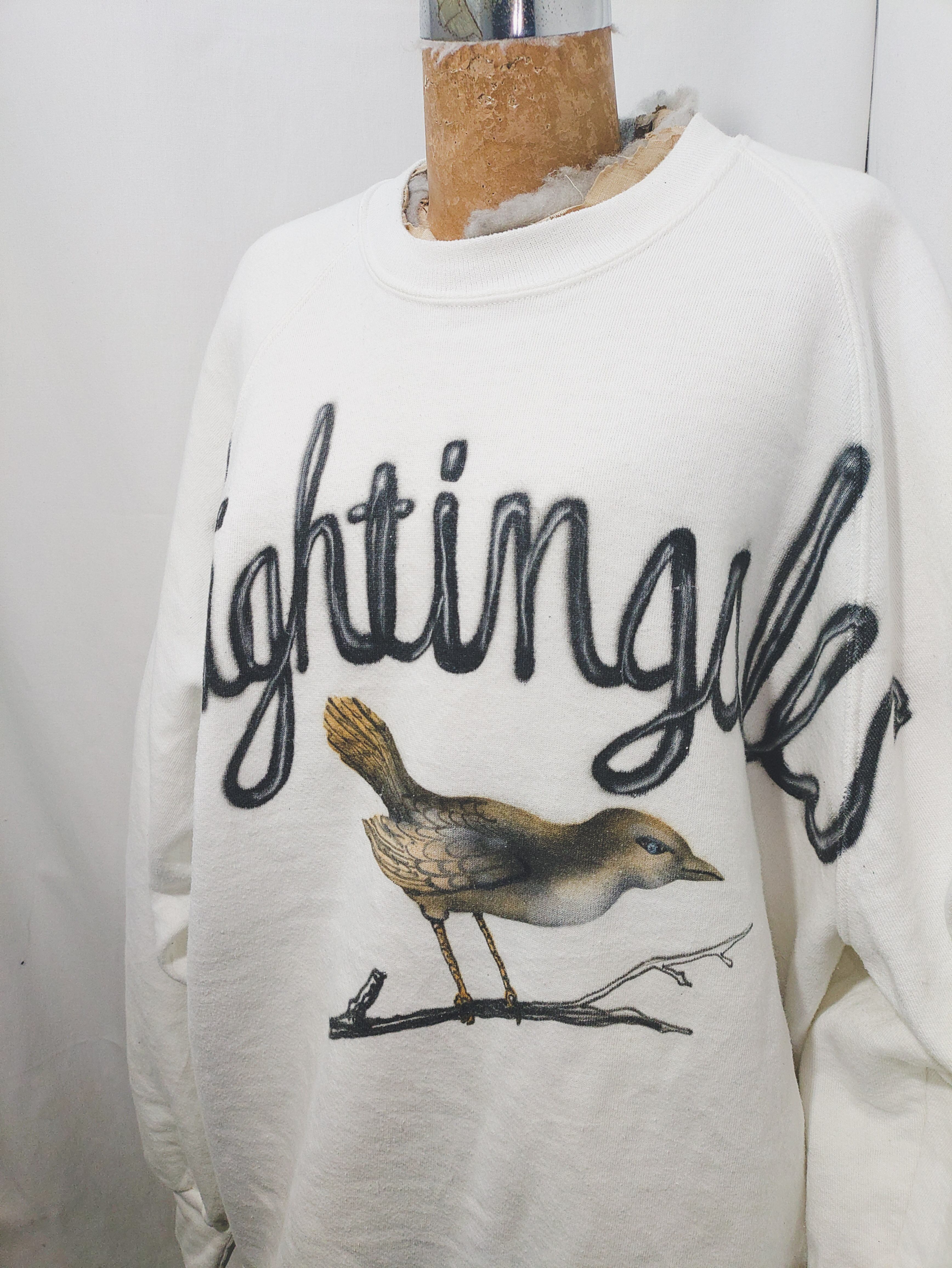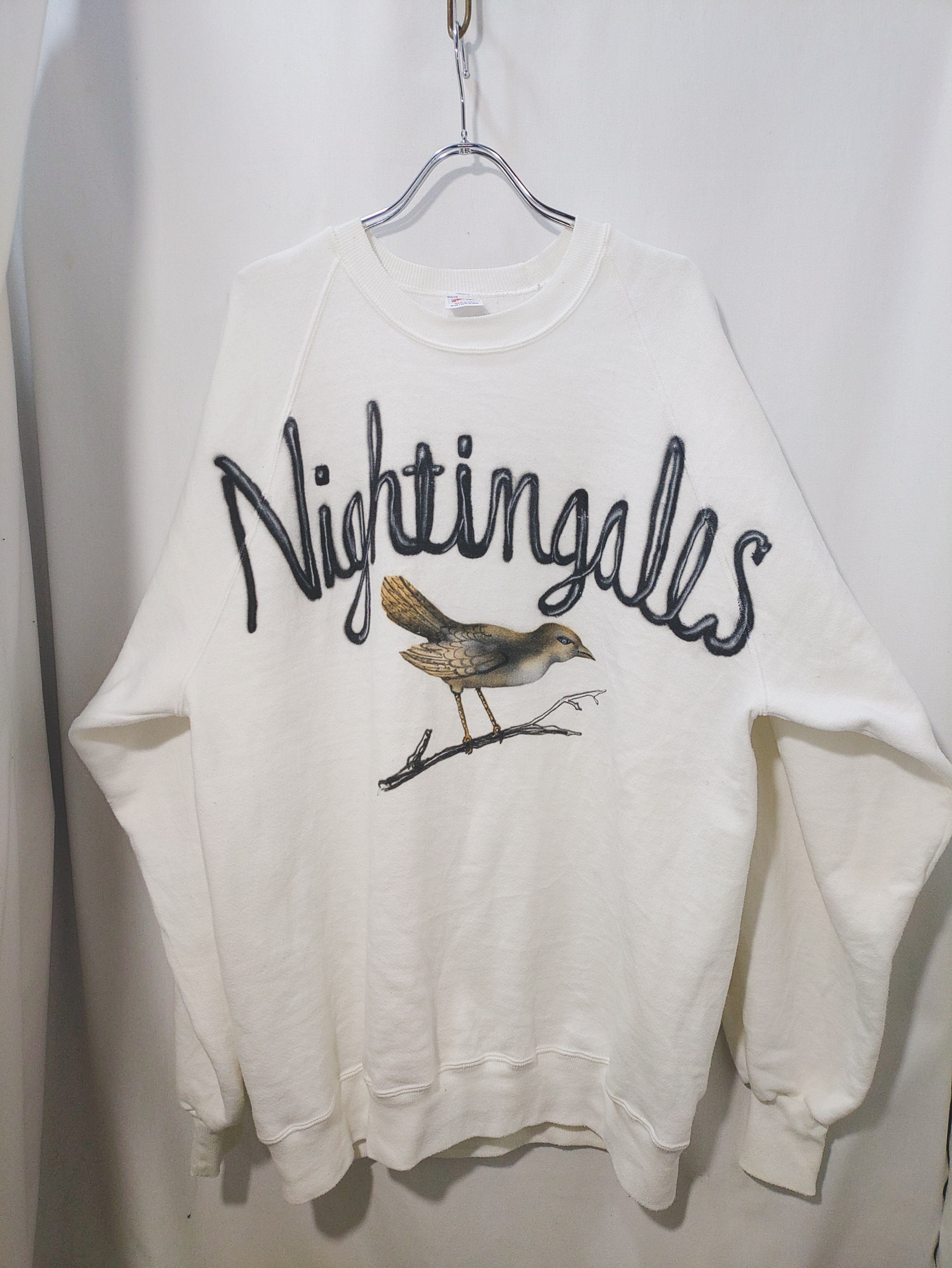 裏起毛のアメリカ製ボディにフロントには"Nightingale"(サヨナキドリ鳥)がスプレーアートの様な手法で描かれています。