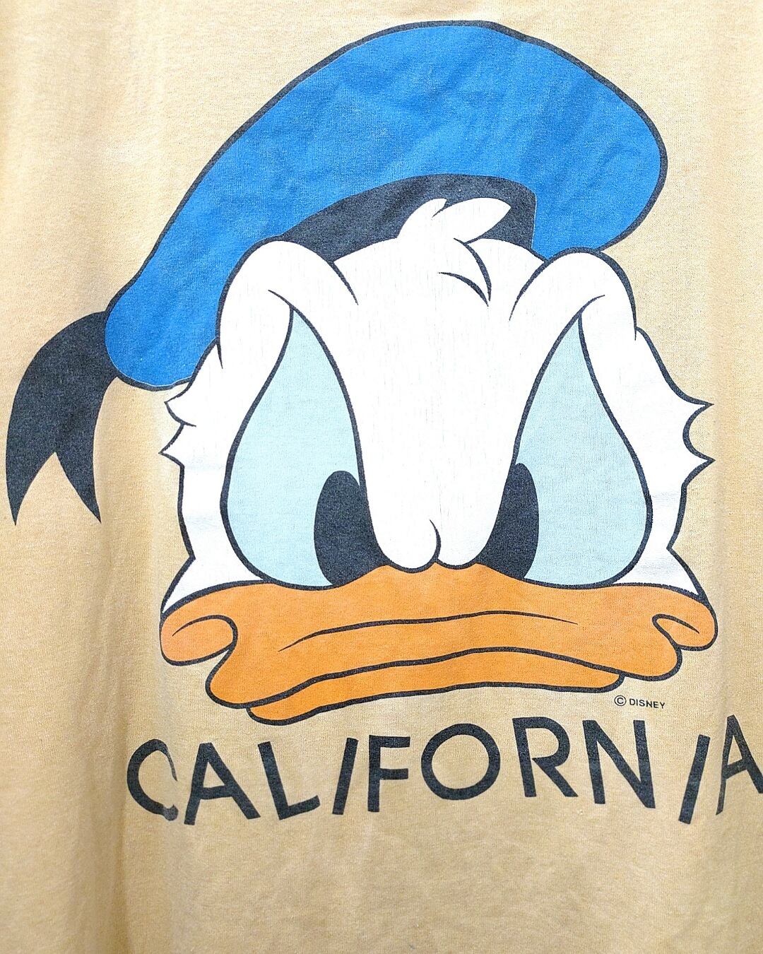 フロント全面にドナルドダックの顔がプリントされたインパクトのあるデザインで経年の為、若干ヒビ割れしたプリント、フェードしたボディカラーがビンテージライクな雰囲気を醸し出しています。