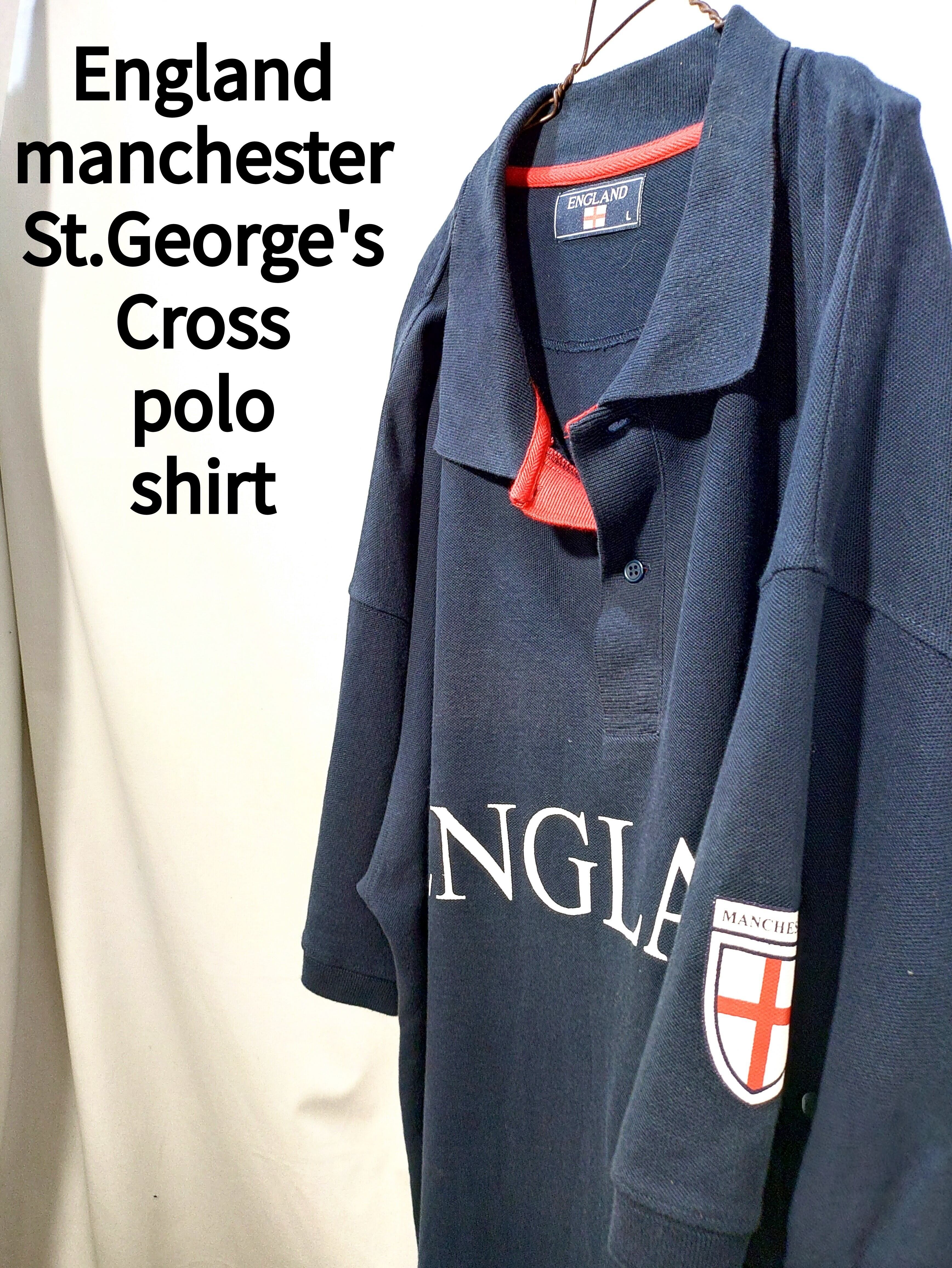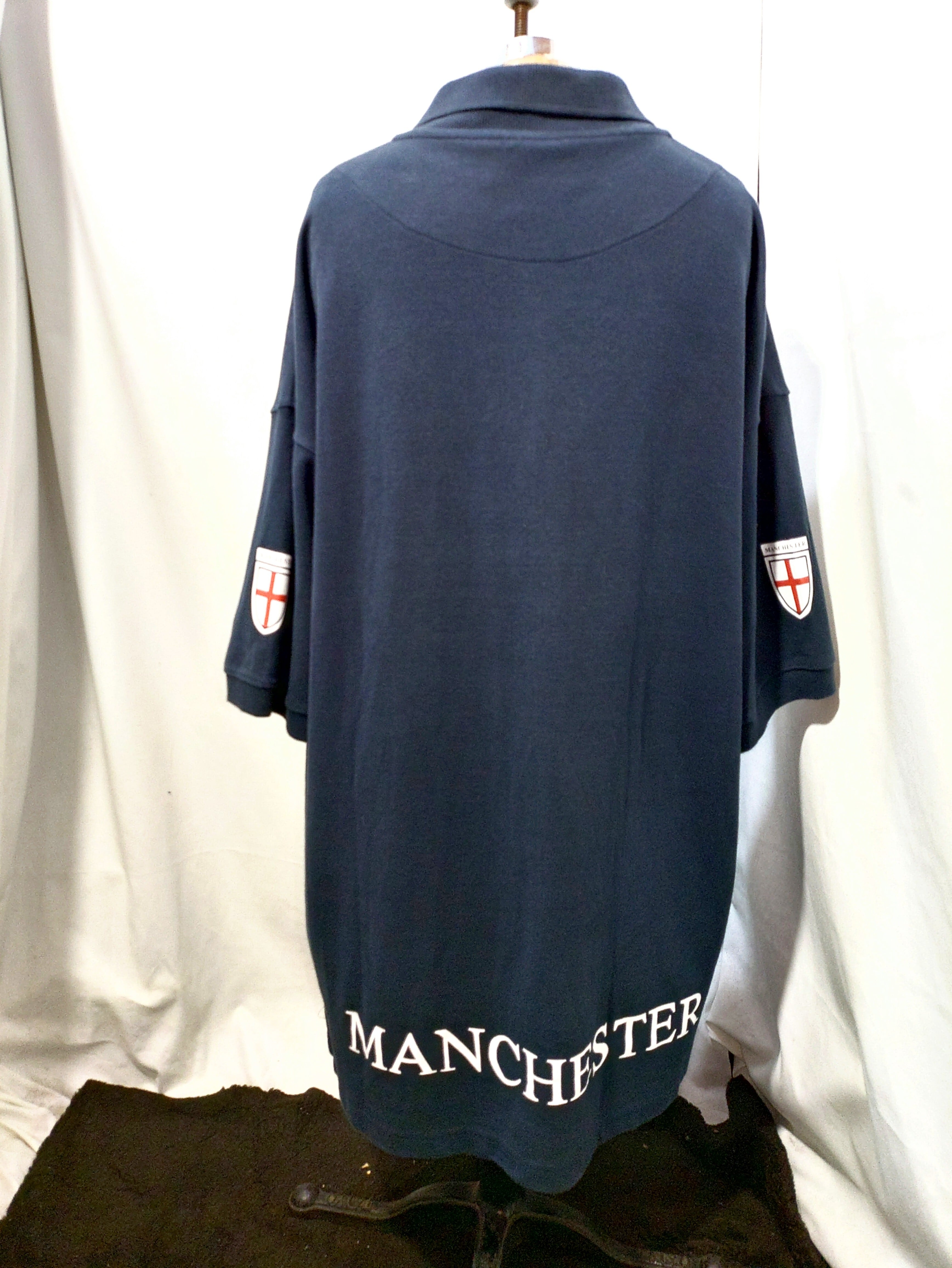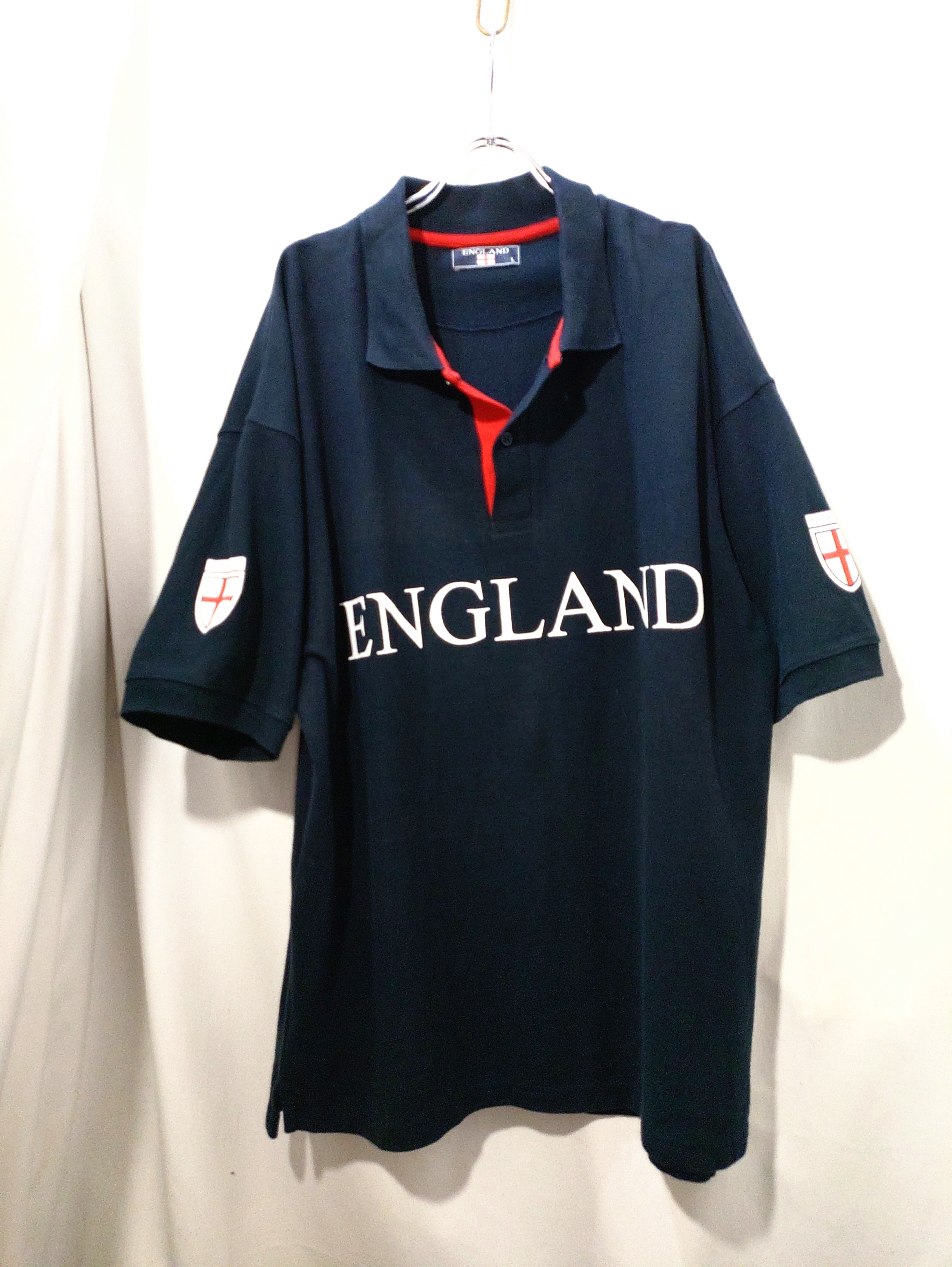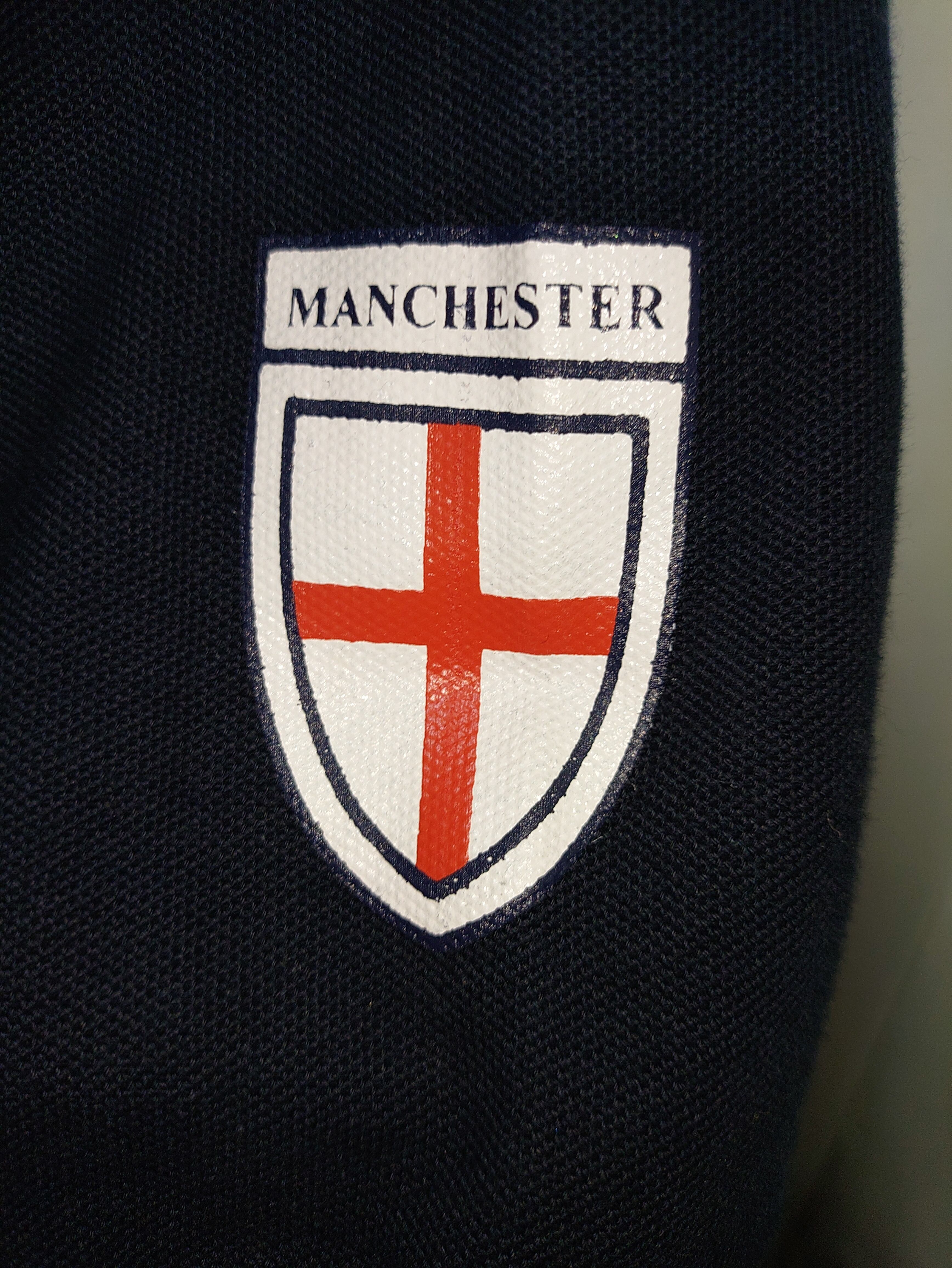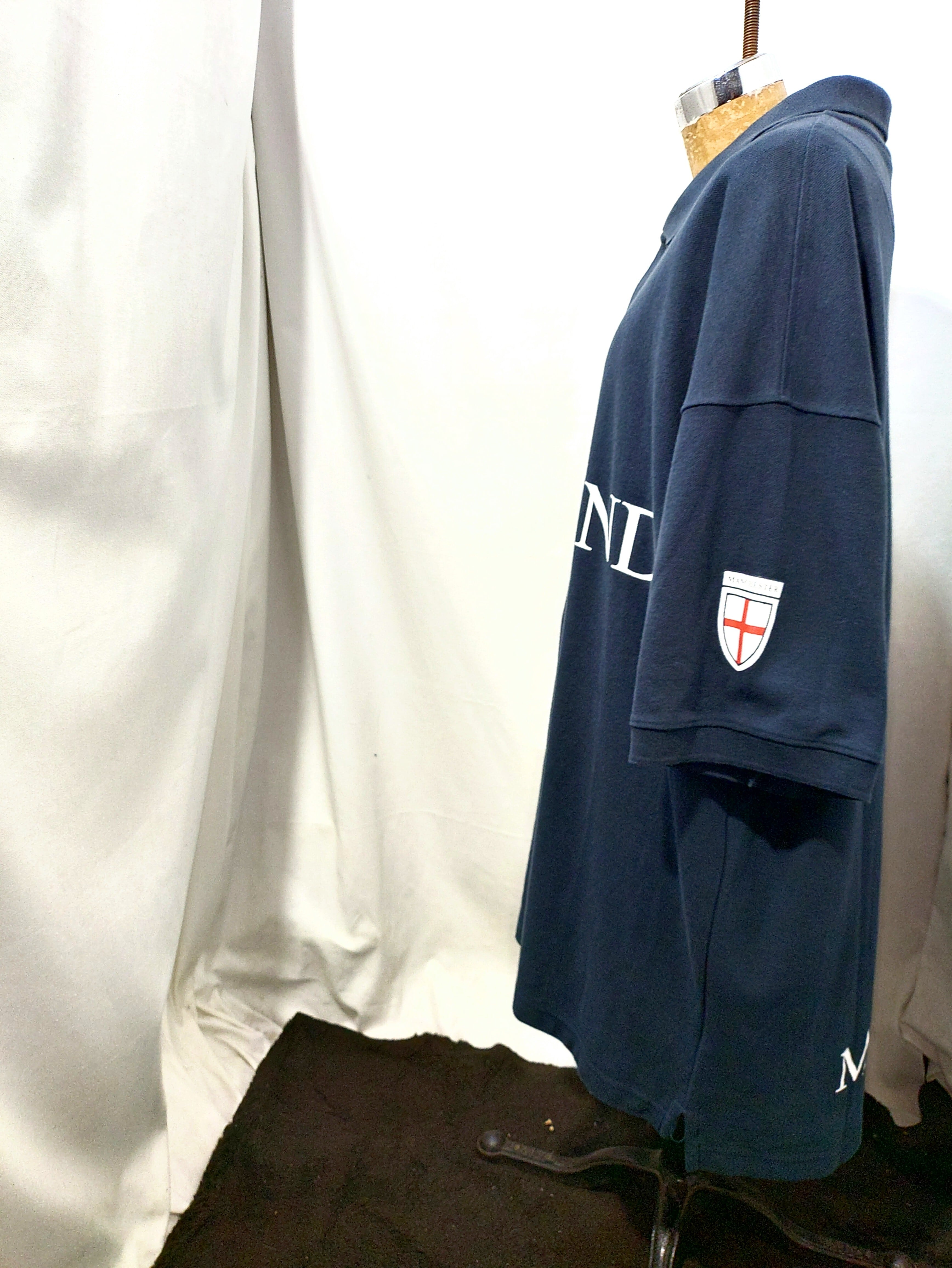 比較的近代物かと思われますが、サッカーやラグビーなどの代表選手が着用されている物と酷似したデザインで、両袖にイングランドの国旗でもあるセントジョージズクロス(St.George's Cross)がプリントされ、フロントには"ENGLAND"バック裾には"MANCHESTER"の文字が入り、胸元の赤い切り返しが特徴的なシンプルながらに英国紳士の気品あるデザインです。