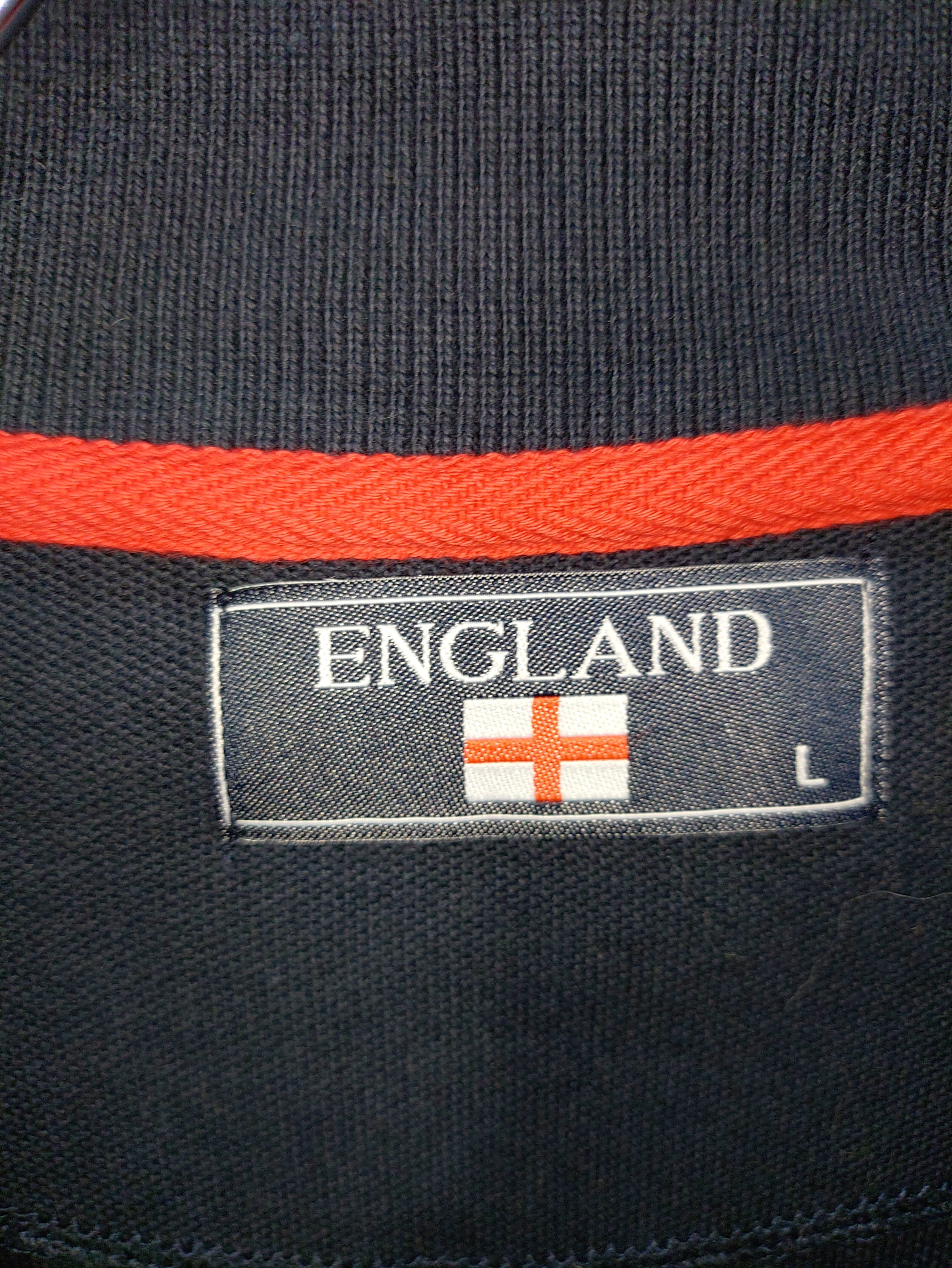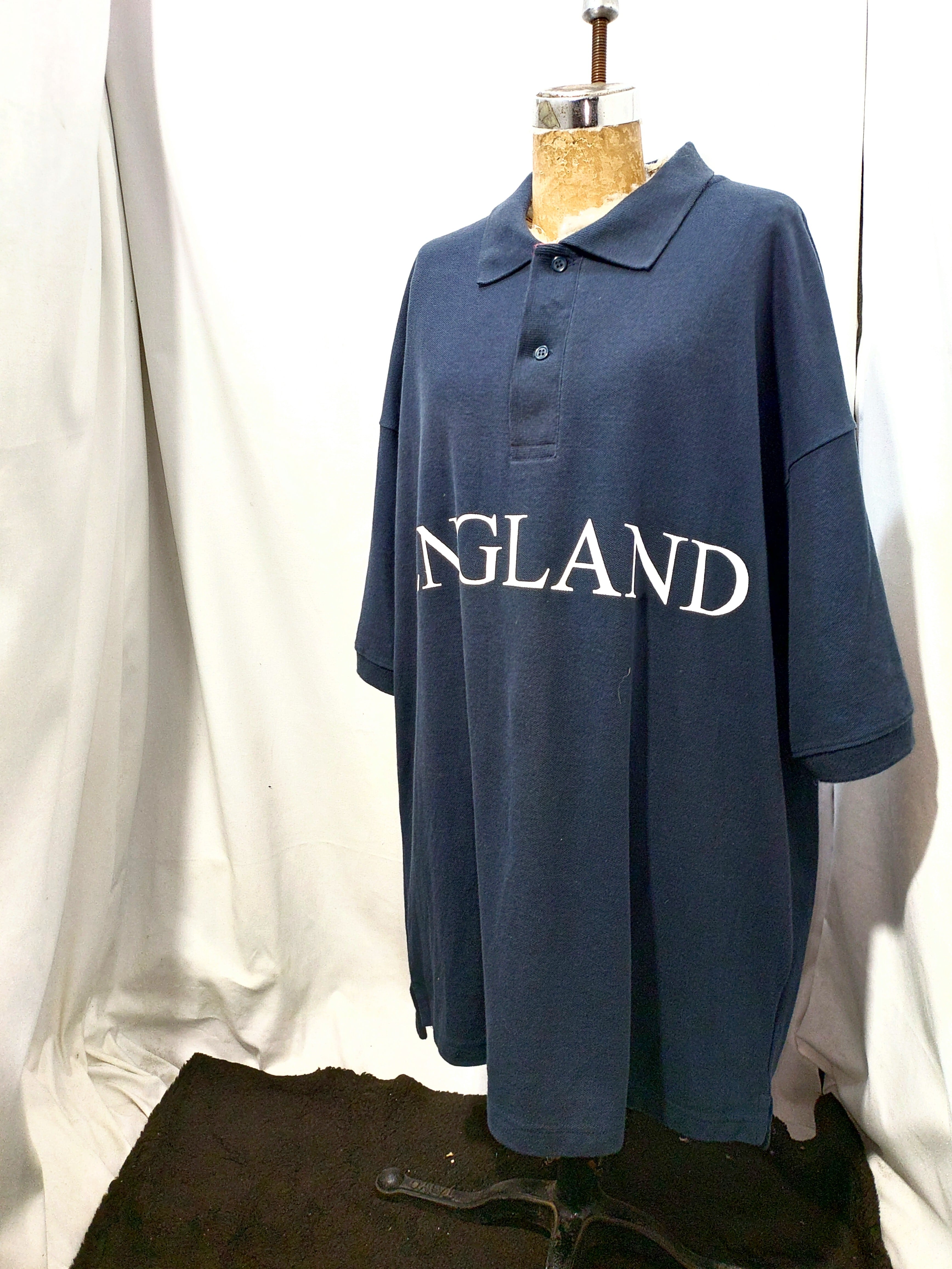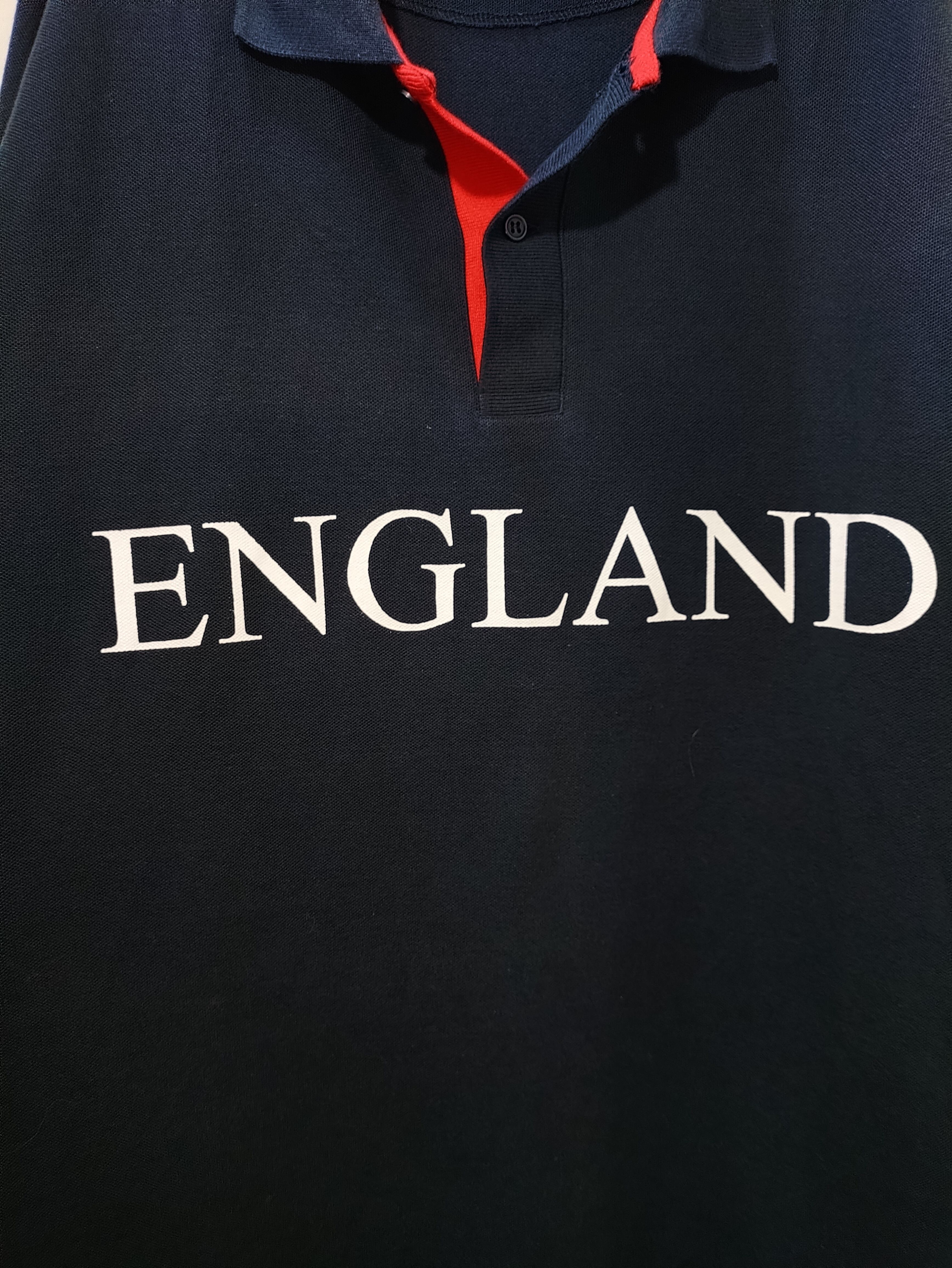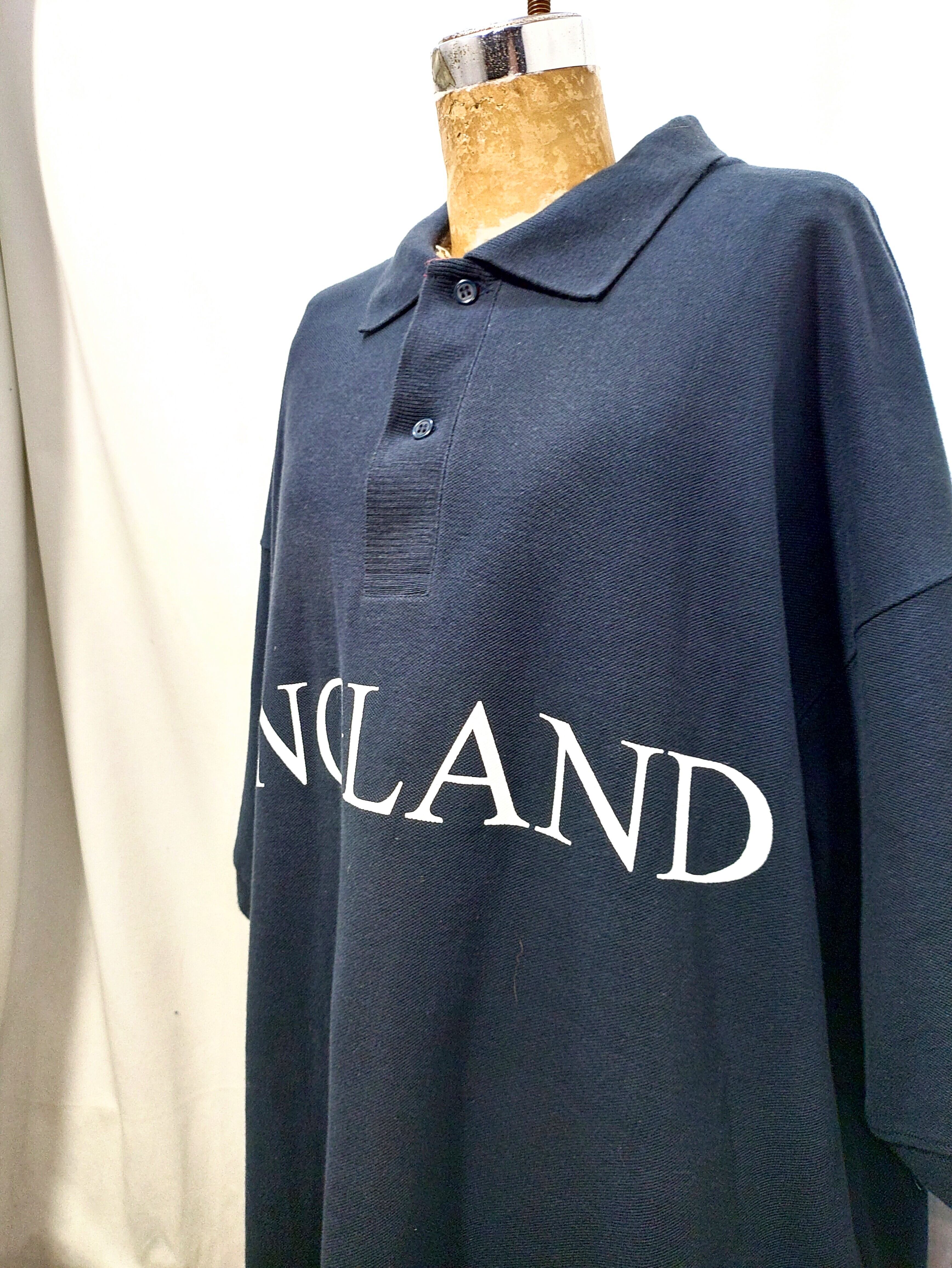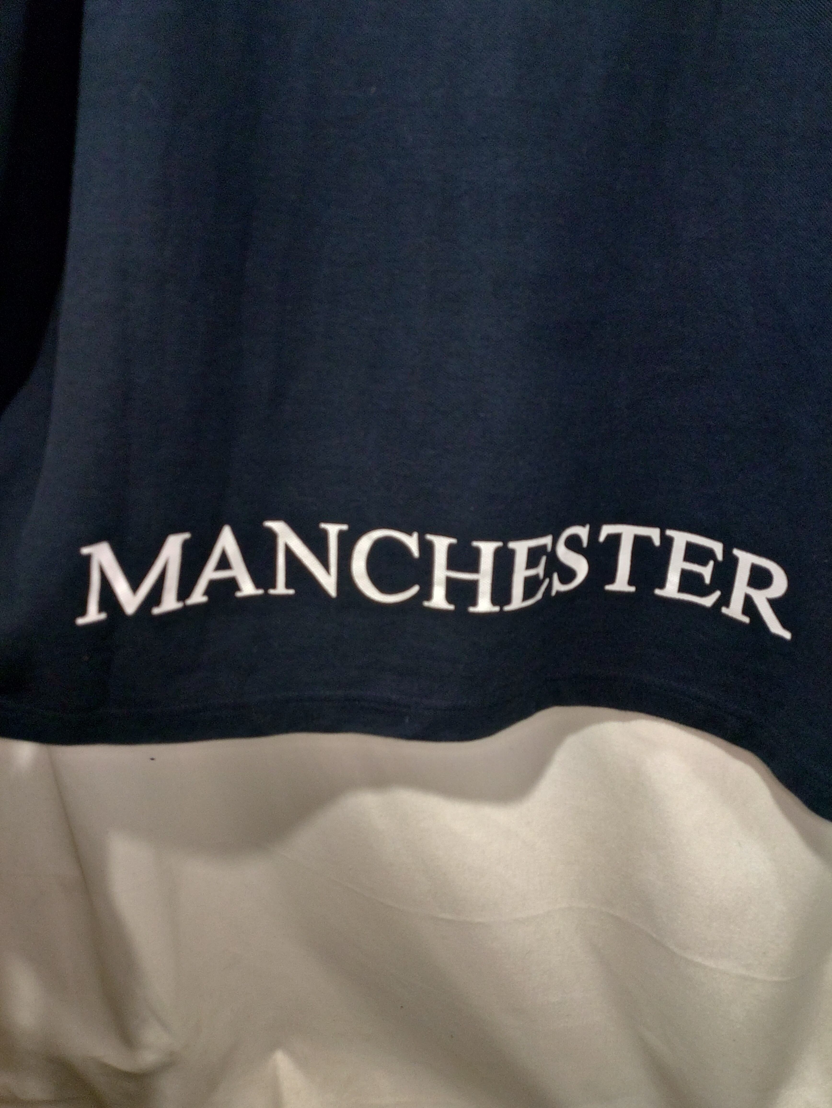比較的近代物かと思われますが、サッカーやラグビーなどの代表選手が着用されている物と酷似したデザインで、両袖にイングランドの国旗でもあるセントジョージズクロス(St.George's Cross)がプリントされ、フロントには"ENGLAND"バック裾には"MANCHESTER"の文字が入り、胸元の赤い切り返しが特徴的なシンプルながらに英国紳士の気品あるデザインです。